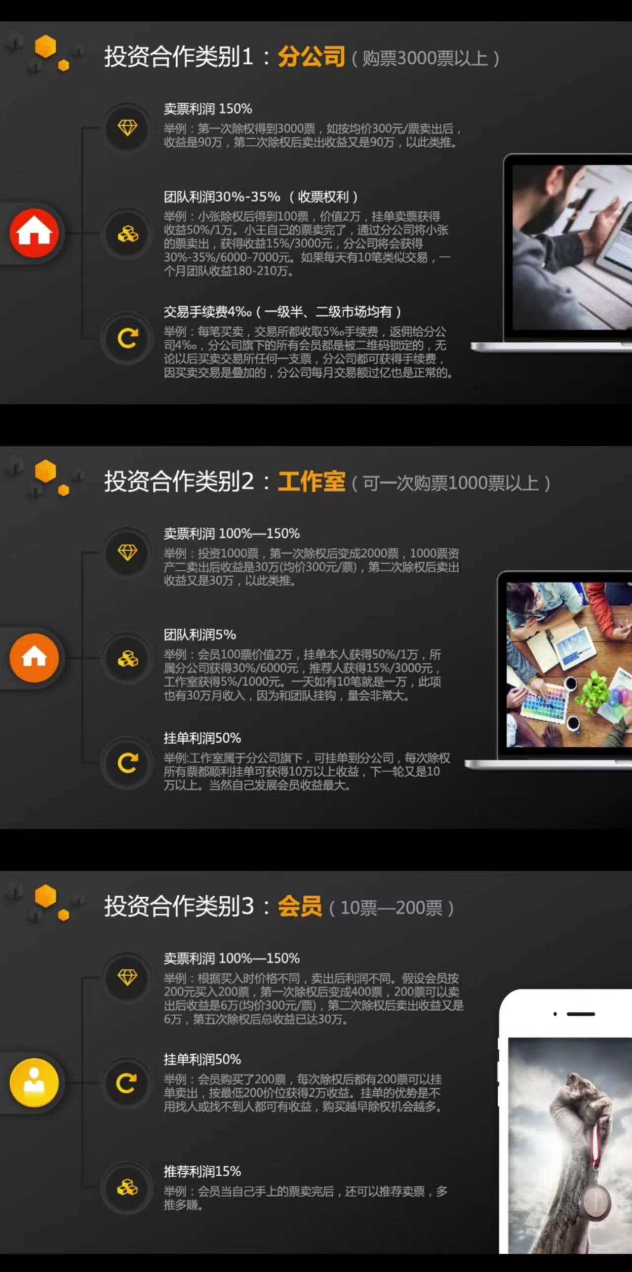 同時,早在2021年5月,蘇州微拍就因涉嫌組織策劃傳銷被沂源縣市場監(jiān)督管理局凍結銀行存款?,F(xiàn)在竟又與甘州文交所合作,搖身一變成立甘文蘇拍,殊不知披了層羊皮的狼也終歸是狼,說是合作,還是同一批人在策劃,收割套路還是原來的配方,交易模式還是熟悉的味道,圈不到原來那批人的錢,只能洗腦后來者。 二、甘文蘇拍的運營騙局 甘文蘇拍的投資合作類型多樣,主要以分公司、工作室、會員為主,每一種利潤都高達100%甚至150%,只要投資,就可以坐等收錢。