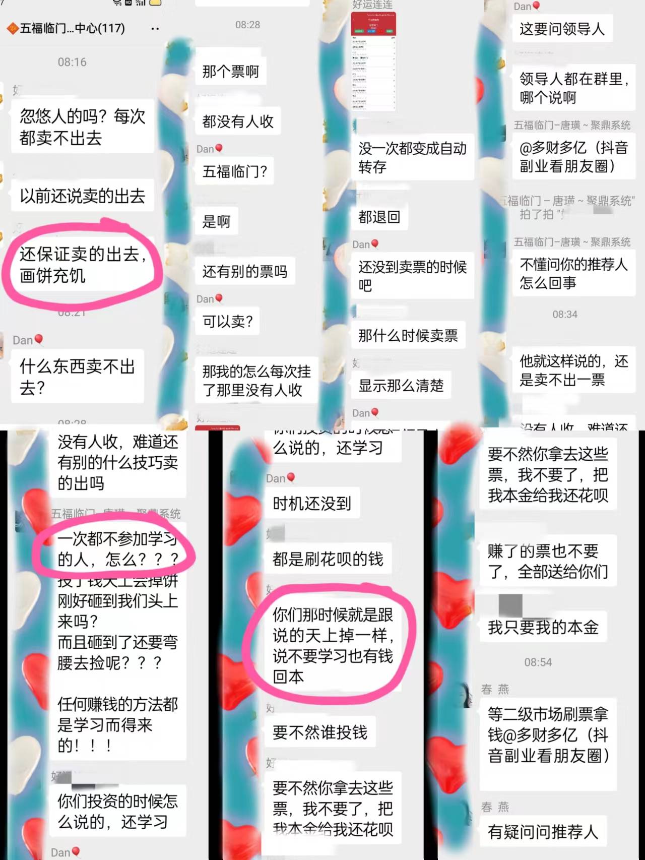然而一段時間之后,群里就不斷有人反應掛出去的票根本沒有人收,投的錢都是用花唄支付,現(xiàn)在連花唄都還不上。而平臺便以不參加學習才沒有收益、需要找人刷票為由搪塞,受害人要求退還本金,平臺便要求其聯(lián)系推薦人就不再回復。