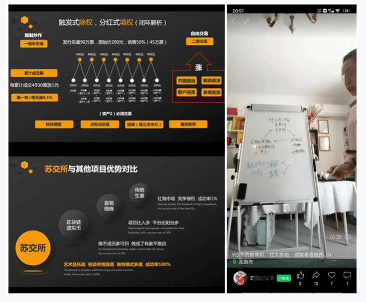 其實,他們發(fā)布的所有產(chǎn)品并沒有實際的收藏價值,只是用來炒作的工具。購買的新票,用傳銷式的手段拉人進盤投資,內(nèi)盤人居多,外盤只有一些零散的散戶。從幾塊錢一直拉升瘋狂吸金制造這只票很火的假象,至于到底是拉升還是拉低,全靠背后的內(nèi)部操盤手,無非是騙取更多人進盤,好收割“韭菜”。 三、如何辨別 根據(jù)郝女士反應,僅僅她所在的江西縣城,就有上百人參與,而“甘文蘇拍”在廣西即將組織的培訓,也已有近千人響應。網(wǎng)絡上已經(jīng)有大量受害者反應被騙,其家人們至今仍被洗腦,深陷其中無法自拔。