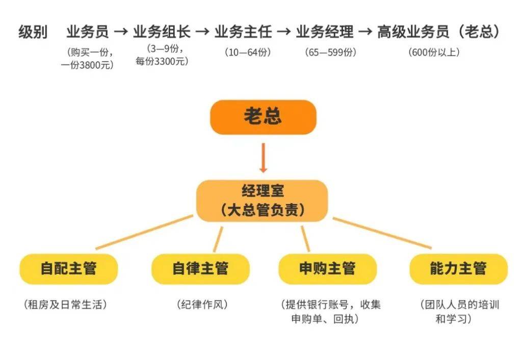 該傳銷團(tuán)伙內(nèi)部分工明確,組織架構(gòu)嚴(yán)密,成員之間單線聯(lián)系。團(tuán)伙的傳銷經(jīng)營模式為“五級三晉”制,五級是:業(yè)務(wù)員、業(yè)務(wù)組長、業(yè)務(wù)主任、業(yè)務(wù)經(jīng)理、高級業(yè)務(wù)員(老總),三晉是:業(yè)務(wù)員、組長晉升為主任、主任晉升為經(jīng)理、經(jīng)理晉升為老總。