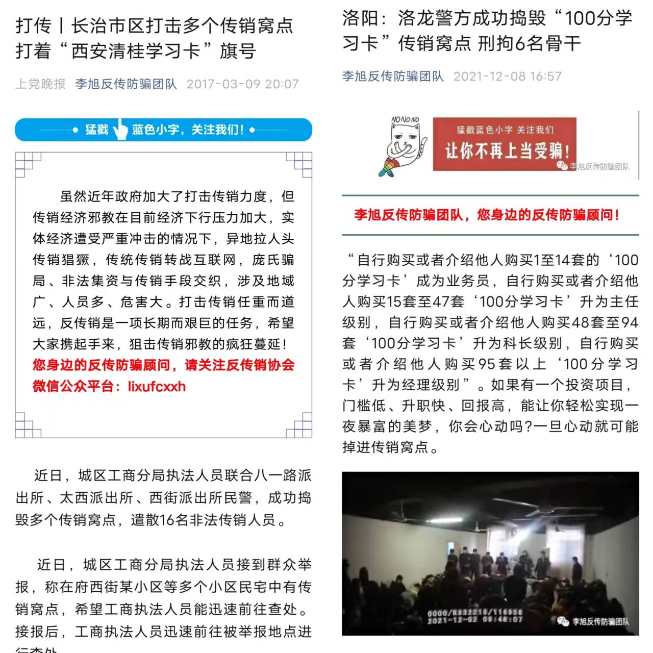 根據(jù)調(diào)查,目前日照此類型的傳銷組織有兩個(gè),一個(gè)以江西地區(qū)為主,一個(gè)以云貴川陜?yōu)橹?,江西團(tuán)隊(duì)領(lǐng)導(dǎo)姓文,而另一個(gè)團(tuán)隊(duì)的領(lǐng)導(dǎo)為胡某和蘇某。其上級(jí)有顧、田、羅、孟、張五位總監(jiān)。 其中部分受害者發(fā)現(xiàn)此為傳銷組織想要逃離,奈何傳銷頭目竟要求繳納320萬(wàn)元高昂出局費(fèi),且投卡越多,出局費(fèi)就越高,受害者們只能繼續(xù)參與其中,期盼真的能掙到回頭錢。 四、國(guó)家嚴(yán)厲打擊,腳步從未停歇近年來(lái),國(guó)家打擊傳銷的腳步從未停歇,李旭反傳防騙團(tuán)隊(duì)也曾報(bào)道過(guò)多起傳銷窩點(diǎn)被搗毀的案例。