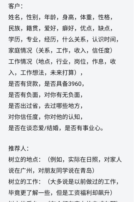 為了幫助新人拉人頭,組織者把每一個(gè)潛在的客戶詳細(xì)信息都列在上面,相互交流,相互探討。 三、南北傳銷套路深,想要脫身難加難近年來(lái)隨著傳銷模式的演變,傳銷組織分成南北兩個(gè)派別,每個(gè)派別都屬于異地傳銷(異地邀約,把人從甲地騙到乙地,封閉或者半封閉式洗腦),都利用傳銷的慣用制度“五級(jí)三階(晉)制為制度,通過(guò)購(gòu)買商品或者投資份額取得加入資格(入門費(fèi)),運(yùn)用幾何倍增原理發(fā)展下線組成上下線層級(jí)關(guān)系;層層返利形成多層次計(jì)酬。這兩種傳銷模式完全具備傳銷的特征,是《禁止傳銷條例》嚴(yán)令禁止的。北派傳銷屬于異地傳銷的初級(jí)版,南派傳銷屬于異地傳銷的升級(jí)版。這兩派傳銷,并不是嚴(yán)格按地域劃分的,主要是操作模式上有很大的區(qū)別。 像上述這種異地邀約,吃大鍋飯、睡地鋪,一個(gè)家住10多個(gè)人,集中上課,以磨礪意志為假象,條件比較艱苦,有控制手機(jī)、非法拘禁等限制自由情況的,是非常典型的北派傳銷。其上當(dāng)受騙的人年齡普遍較小,層次比較低,20歲左右的年輕人居多,畢業(yè)或者未畢業(yè)的大學(xué)生占有很大的比例。