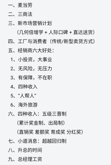 待組織者們覺(jué)得洗腦成功之后,便會(huì)以保護(hù)隱私為由要求其起一個(gè)化名,并同時(shí)要求附上身份證,按手印購(gòu)買一張價(jià)值3960元的學(xué)習(xí)卡,不斷背誦制度課,教授如何邀約新人等等。 二、拉人頭升級(jí)別,傳銷特點(diǎn)十分明顯1、擁有成熟制度體系: 據(jù)調(diào)查,該組織十分成熟,擁有一套完整的制度課內(nèi)容: 5個(gè)級(jí)別,6種好處,4種收入。 5個(gè)級(jí)別:業(yè)務(wù)員,主管,主任,總監(jiān),總經(jīng)理。 6種好處:一:小投資,大事業(yè)。二:無(wú)風(fēng)險(xiǎn),無(wú)壓力。 三:有保障。四:四種收入。五:人幫人。六:海外旅游。 4種收入:一:直銷獎(jiǎng)。二:差額獎(jiǎng)。三:育成獎(jiǎng)。四:分紅獎(jiǎng)。