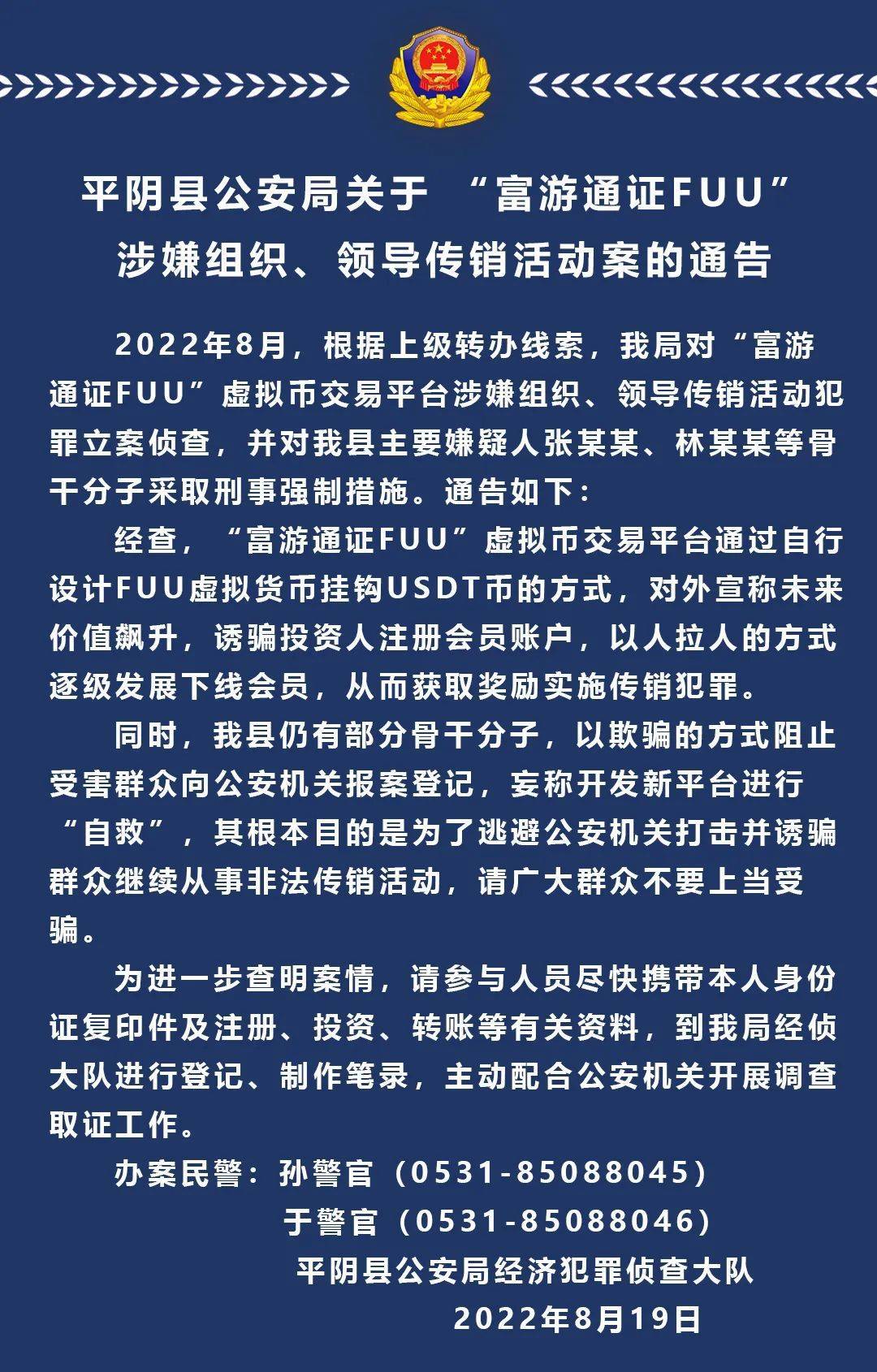 發(fā)表時(shí)間:2022-08-20 16:42作者:濟(jì)南平陰公安來源:濟(jì)南平陰公安 平陰縣公安局關(guān)于 “富游通證FUU”涉嫌 組織、領(lǐng)導(dǎo)傳銷活動(dòng)案的通告 2022年8月,根據(jù)上級轉(zhuǎn)辦線索,我局對“富游通證FUU”虛擬幣交易平臺(tái)涉嫌組織、領(lǐng)導(dǎo)傳銷活動(dòng)犯罪立案偵查,并對我縣主要嫌疑人張某某、林某某等骨干分子采取刑事強(qiáng)制措施。通告如下: 經(jīng)查,“富游通證FUU”虛擬幣交易平臺(tái)通過自行設(shè)計(jì)FUU虛擬貨幣掛鉤USDT幣的方式,對外宣稱未來價(jià)值飆升,誘騙投資人注冊會(huì)員賬戶,以人拉人的方式逐級發(fā)展下線會(huì)員,從而獲取獎(jiǎng)勵(lì)實(shí)施傳銷犯罪。 同時(shí),我縣仍有部分骨干分子,以欺騙的方式阻止受害群眾向公安機(jī)關(guān)報(bào)案登記,妄稱開發(fā)新平臺(tái)進(jìn)行“自救”,其根本目的是為了逃避公安機(jī)關(guān)打擊并誘騙群眾繼續(xù)從事非法傳銷活動(dòng),請廣大群眾不要上當(dāng)受騙。 為進(jìn)一步查明案情,請參與人員盡快攜帶本人身份證復(fù)印件及注冊、投資、轉(zhuǎn)賬等有關(guān)資料,到我局經(jīng)偵大隊(duì)進(jìn)行登記、制作筆錄,主動(dòng)配合公安機(jī)關(guān)開展調(diào)查取證工作。 辦案民警:孫警官、于警官 平陰縣公安局經(jīng)濟(jì)犯罪偵查大隊(duì) 2022年8月19日