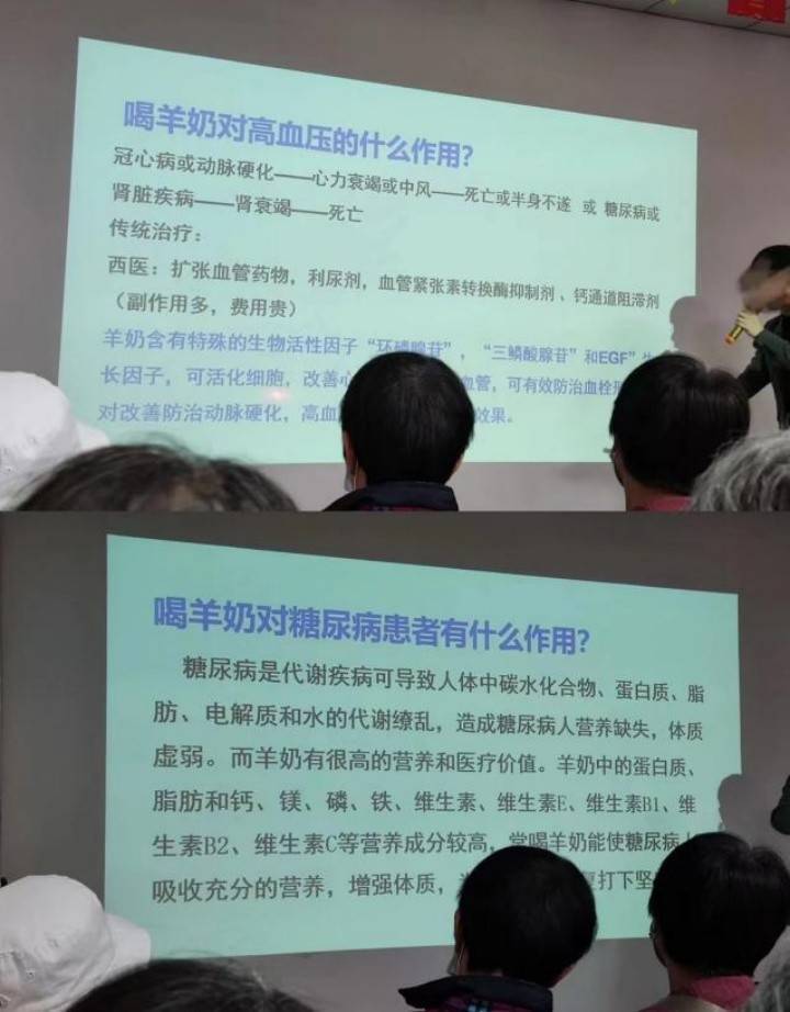 講座上,一位自稱為營(yíng)養(yǎng)師的銷售人員,從老年健康知識(shí),講到羊奶最接近母乳,并強(qiáng)調(diào)牛奶行業(yè)安全問題頻發(fā)。他還引用《本草綱目》相關(guān)記載,宣稱羊奶有助于治療各種疾病,還能提高免疫力、助眠安神、延緩皮膚衰老......