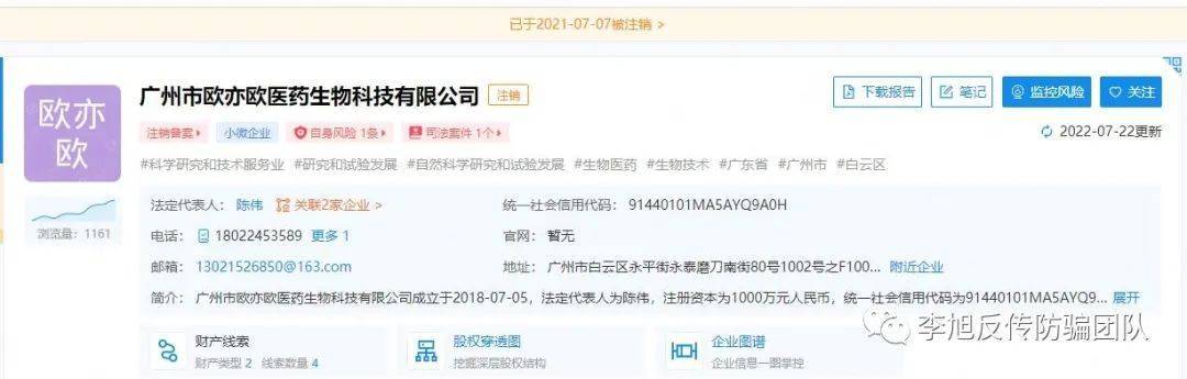 廣州歐億歐公司成立于2018年7月5日,法定代表人陳偉,2021年7月7日被注銷備案。