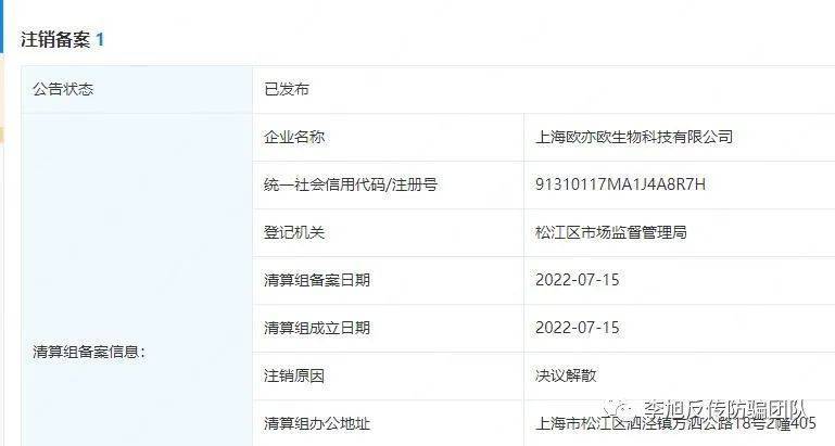 知情人士還提到,在廣州歐亦歐之后,最新出現(xiàn)在產(chǎn)品外包裝上的總經(jīng)銷商為上海歐亦歐生物科技有限公司(以下簡稱上海歐亦歐公司),上海歐亦歐公司成立于2020年6月9日,2022年7月,也已經(jīng)申請注銷備案。