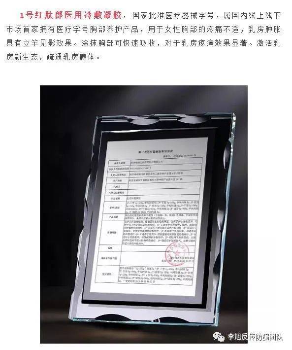 有意思的是,李旭反傳防騙團(tuán)隊還發(fā)現(xiàn),備案號為“陜咸械備20190006號”的這款冷敷凝膠這兩年又出現(xiàn)在其他微商團(tuán)隊。據(jù)了解,一款名為“御京盛醫(yī)用冷敷凝膠”的產(chǎn)品火遍朋友圈,該產(chǎn)品宣傳有治療近視、弱視、散光、改善飛蚊癥、白內(nèi)障、青光眼、祛除眼袋、黑眼圈、魚尾紋、眼細(xì)紋等神奇功效。代理介紹,“御京盛·醫(yī)用冷敷凝膠”含有密蒙花、谷精草、決明子、野菊花、蒲公英、人工牛黃、薄荷腦、冰片八大核心成分,運(yùn)用干細(xì)胞恒溫存貯技術(shù),中草藥和細(xì)胞因子共同作用,改善、抗衰。產(chǎn)品頭部采用滾珠設(shè)計,只需要打開蓋子,順著眼眶周圍涂抹,然后閉眼休息15分鐘,就可以提升裸眼視力1-4行,緩解眼脹、眼干澀,有效治療近視、弱視、散光等病癥,去除黑眼圈、眼部細(xì)紋、改善青光眼、白內(nèi)障、老花眼、飛紋眼等眼疾。根據(jù)代理提供的產(chǎn)品備案信息可看到,其備案號就是上述備案號。
