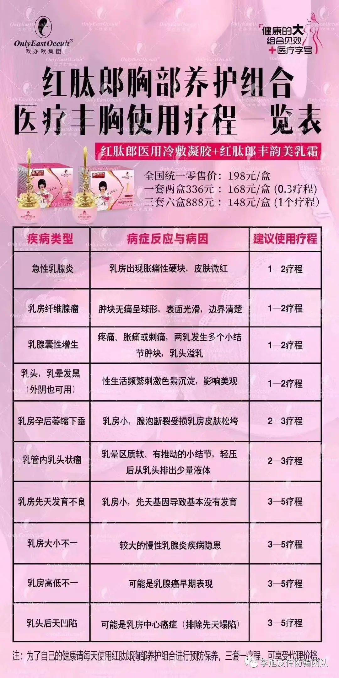 “歐亦歐”紅肽郎胸部養(yǎng)護(hù)組合(紅肽郎醫(yī)用冷敷凝膠+紅肽郎豐潤美乳霜),宣傳是國內(nèi)線上線下市場首家擁有醫(yī)療字號胸部養(yǎng)護(hù)產(chǎn)品,用于女性胸部的疼痛不適、乳房腫脹具有立竿見影效果,且針對急性乳腺炎、乳房纖維腺瘤、乳腺囊性增生、乳房孕后萎縮下垂、乳管內(nèi)乳頭狀瘤等癥狀都有效果,并給出建議使用療程。