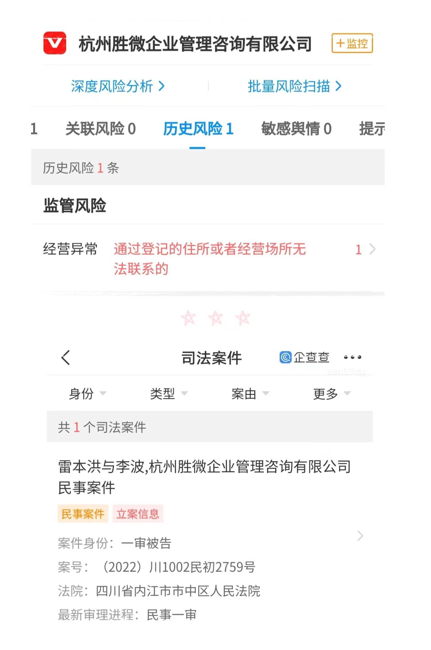 然而根據(jù)萊女士的反饋,這所謂的研討會(huì),就是拉人頭的翻版,而他們承諾的分成,也是依托在這些研討會(huì)上。 三、不斷收割,不斷更名的創(chuàng)業(yè)公社 通過(guò)調(diào)查我們發(fā)現(xiàn),杭州勝微企業(yè)管理咨詢有限公司不但在21年2月已經(jīng)注銷,22年又因民事糾紛因被告上法庭,目前還在一審中。