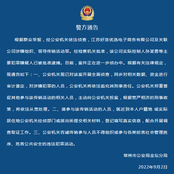 根據(jù)群眾舉報,經(jīng)公安機關依法偵查,江蘇好滌優(yōu)選電子商務有限公司及關聯(lián)公司涉嫌組織、領導傳銷活動罪。經(jīng)檢察機關批準,該公司實際控制人孫某勇等主要犯罪嫌疑人已被批準逮捕。目前,案件正在進一步偵辦中。