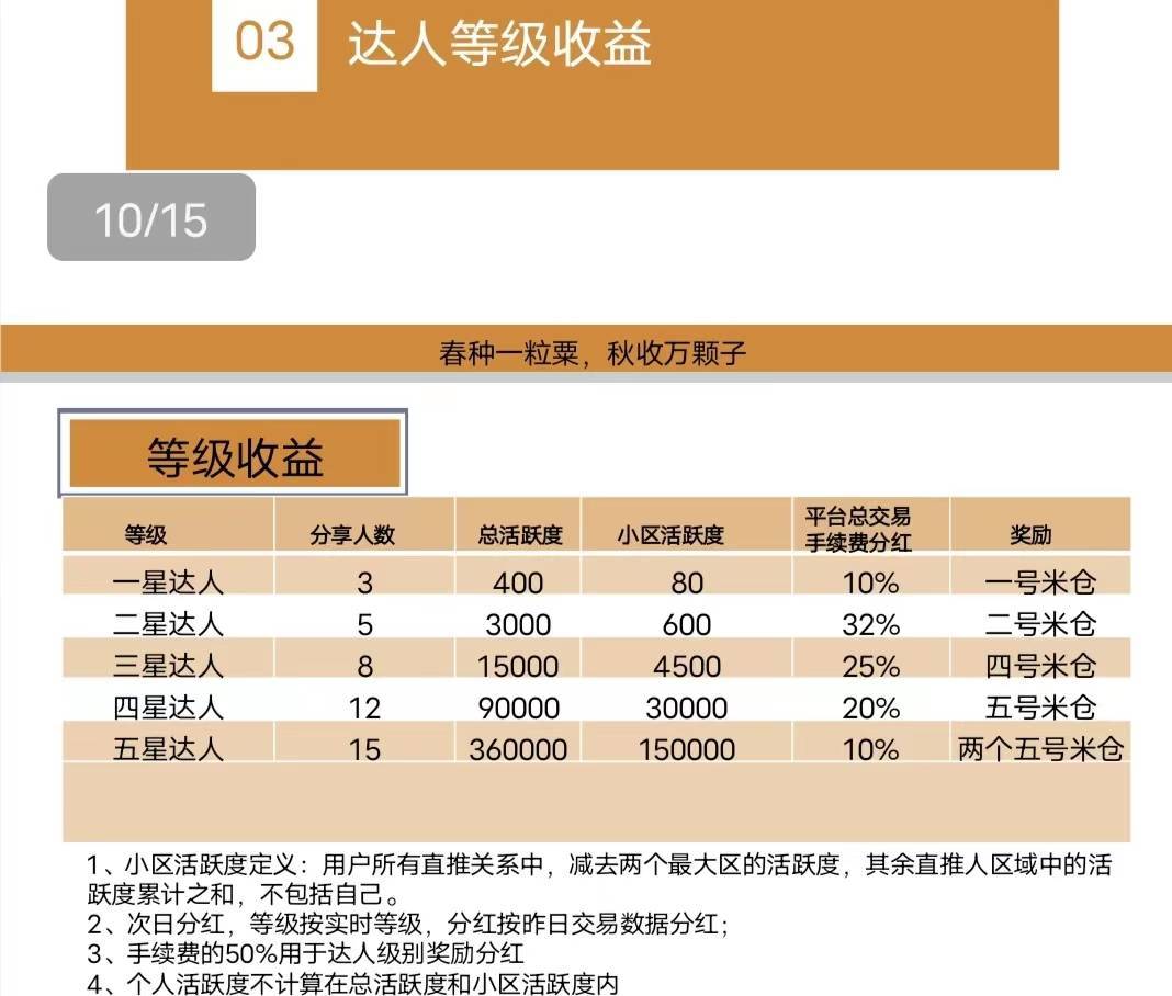 但是,這些獎(jiǎng)勵(lì)收益十分有限,“萬民商城”便提出,直接分享邀請,就可再享受直接分享人獎(jiǎng)勵(lì)的8%。例如:5號(hào)(星)米倉收益為1500,邀請人每天享受1500*8%/35的任務(wù)周期。 不僅如此,“萬民商城”還將推薦達(dá)人分為1-5星5個(gè)等級(jí),每個(gè)等級(jí)達(dá)到規(guī)定的分享人數(shù)及活躍度,即可獲得相對應(yīng)的平臺(tái)總交易手續(xù)費(fèi)的分紅。平臺(tái)總交易手續(xù)費(fèi)50%每天不斷累加形成一個(gè)獎(jiǎng)勵(lì)池,按權(quán)重分配。等級(jí)越高,分紅也越多。具體獎(jiǎng)勵(lì)如下圖: