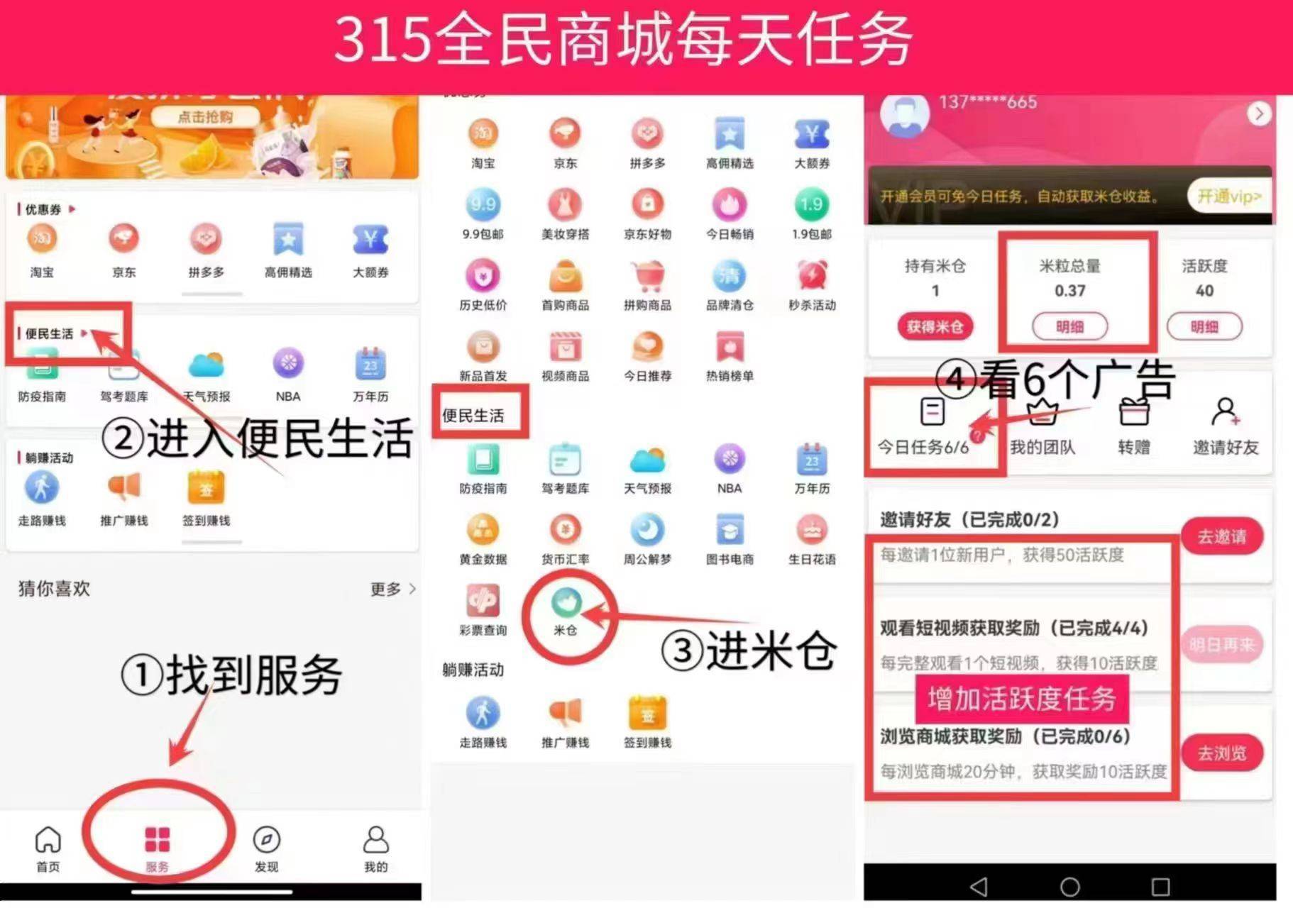 該平臺(tái)號(hào)稱響應(yīng)國家號(hào)召,是315授權(quán)的唯一直屬電商平臺(tái),擁有豐富的服務(wù)品類,旨在為誠信中小企業(yè)產(chǎn)品提供便攜銷售渠道,為每位消費(fèi)者創(chuàng)造安全的購物環(huán)境。同時(shí),該平臺(tái)宣稱自己擁有全國315產(chǎn)品追溯系統(tǒng),并由315電商指導(dǎo)中心親自督導(dǎo)。 既然如此,作為一個(gè)電商平臺(tái),又是如何實(shí)現(xiàn)百萬高收益的呢? 根據(jù)資料顯示,萬民商城的收益是靠“米倉”來實(shí)現(xiàn)的,用戶全民商城看視頻、分享的行為都被系統(tǒng)記錄下來,并作為原始賬頁信息并進(jìn)行分析得到相應(yīng)的識(shí)別。采用共識(shí)機(jī)制,根據(jù)記錄用戶每日任務(wù)完成情況可獲得相應(yīng)的獎(jiǎng)勵(lì)。