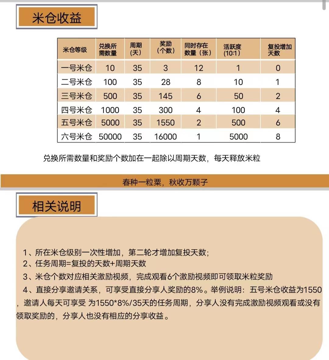 其中,“米倉”被分為1-6號(hào)(星)6個(gè)等級(jí),每個(gè)等級(jí)的收益從3到16000不等,兌換所需數(shù)量和獎(jiǎng)勵(lì)個(gè)數(shù)加在一起除以周期天數(shù),每天釋放米粒,米倉個(gè)數(shù)對應(yīng)相關(guān)激勵(lì)視頻,完成觀看6個(gè)激勵(lì)視頻的任務(wù)即可領(lǐng)取米粒獎(jiǎng)勵(lì)。完成邀請好友、瀏覽商城等任務(wù)后,還可獲得相對應(yīng)的活躍度,具體收益如下圖: