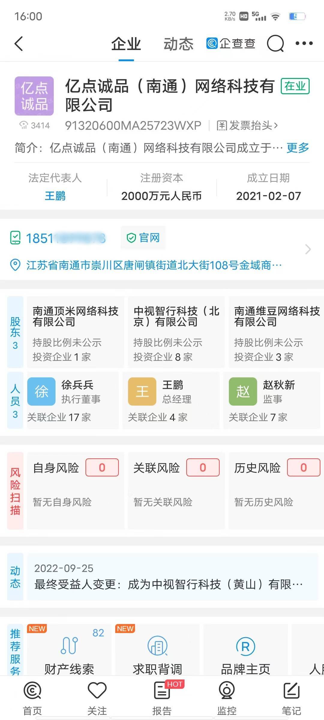 該平臺(tái)叫做“315萬民商城”,隸屬于億點(diǎn)誠品(南通)網(wǎng)絡(luò)科技有限公司,成立于2021年2月,法人代表王鵬。