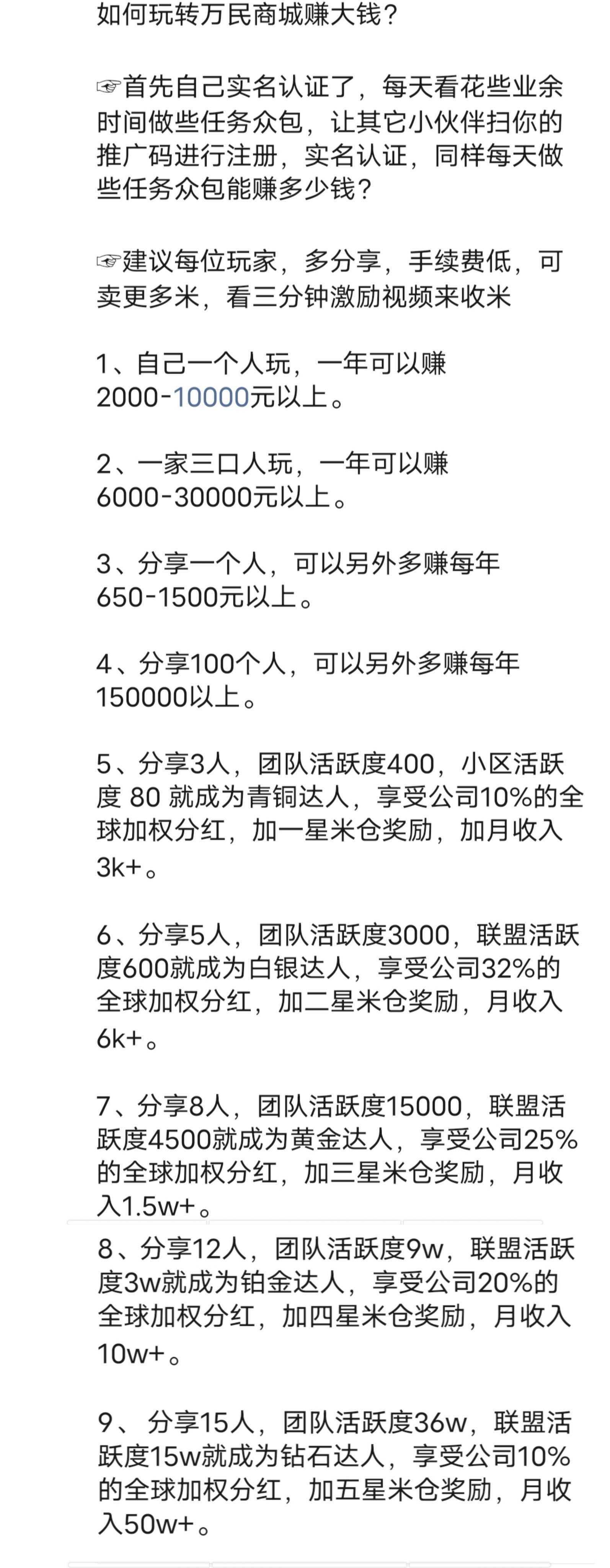為了使參與者更直觀了解“萬民商城”的收益模式,該平臺(tái)對每個(gè)等級(jí)的推薦達(dá)人收益進(jìn)行了計(jì)算,如按照其要求的方式進(jìn)行,分享15人以上,甚至可以月收入高達(dá)50w+。如果真能實(shí)現(xiàn)這樣的收益,簡直連世界首富都要甘拜下風(fēng)了。