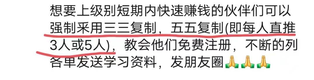 根據(jù)資料顯示,該平臺(tái)不斷鼓勵(lì)加入者強(qiáng)制采用三三、五五復(fù)制(即每人直推3人或5人),以便在短期內(nèi)上級(jí)別,實(shí)現(xiàn)快速賺錢的效果。