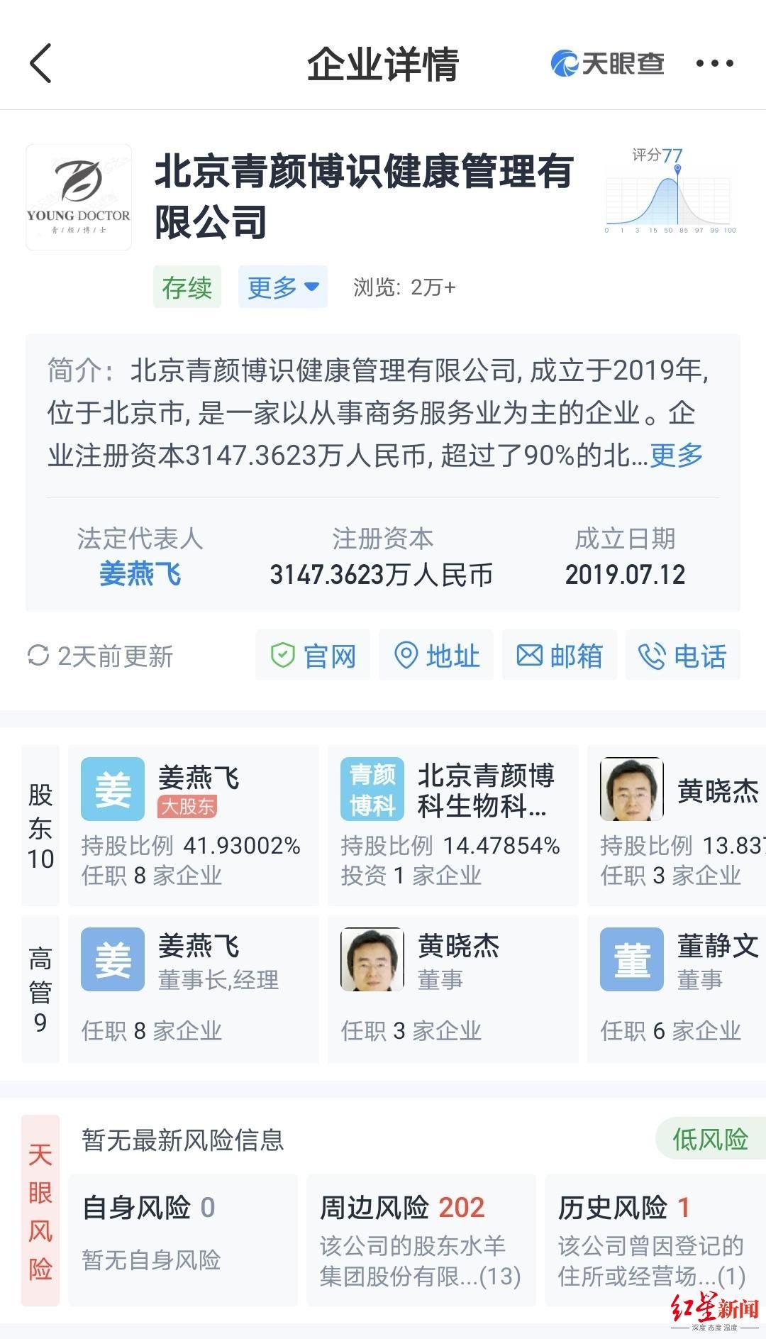 天眼查APP顯示,北京青顏博識健康管理有限公司成立于2019年7月12日,法人代表為姜燕飛,持股比例為41.93%,而其他四位女博士沒有直接持股。據(jù)了解,姜燕飛即為“五個(gè)女博士”之一的姜珺。紅星新聞記者聯(lián)系到姜珺詢問為何改名,其稱屬于個(gè)人原因,與公司經(jīng)營無關(guān)。