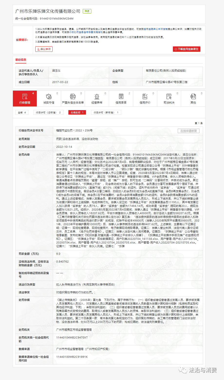 發(fā)表時間:2022-10-20 20:42作者:法治與消費來源:法治與消費 近日,信用中國發(fā)布一則行政處罰決定書,廣州市樂彈樂彈文化傳播有限公司因涉嫌傳銷被處罰9萬元,沒收違法所得8407.62元。