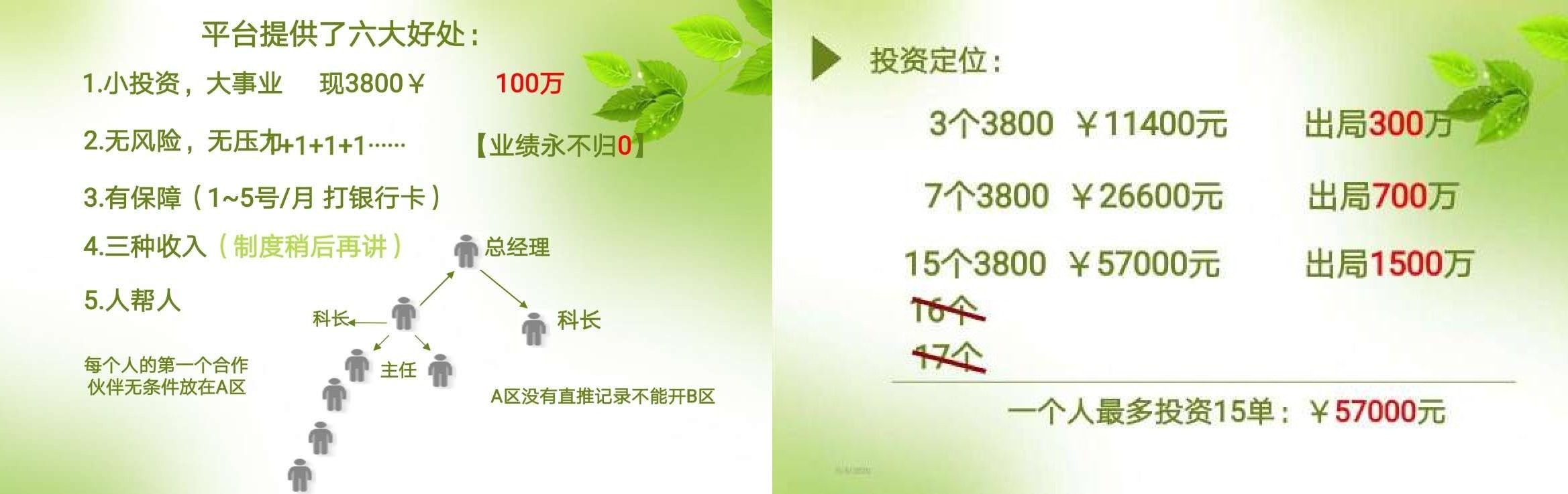 ▲傳銷組織發(fā)出的通知和偽造的公章 經(jīng)過改良的秦皇島“中綠”很快發(fā)展非常迅猛,參與者的年齡和層次也越來(lái)越高,里面也不乏一些層次較高的“退休干部”等高端人群,甚至吸引了很多南派傳銷、民族大業(yè)、資金盤等網(wǎng)絡(luò)傳銷的難民也投身“中綠”商務(wù)商會(huì),夢(mèng)想在“中綠”公司翻盤,把之前的損失撈回來(lái)。 秦皇島“中綠”傳銷在發(fā)展過程中也發(fā)生了一些變異,“中綠”公司本身是不存在的,隨著團(tuán)隊(duì)的快速發(fā)展,心懷鬼胎的經(jīng)理們一直勾心斗角,終于因?yàn)榉众E不均而發(fā)生內(nèi)訌。 2016年7月,“中綠”團(tuán)隊(duì)分崩離析,一些經(jīng)理為了掩人耳目,脫離“中綠”傳銷組織單干,裂變成眾多獨(dú)立的團(tuán)隊(duì),由此,秦皇島的“資本運(yùn)作”行業(yè)便進(jìn)入了無(wú)核心的春秋戰(zhàn)國(guó)時(shí)代,除了老中綠團(tuán)隊(duì),由此產(chǎn)生了黃進(jìn)同的“綠衫團(tuán)隊(duì)”、高果然(高武)的“眾鎖公司團(tuán)隊(duì)”、馬氏家族的“火箭團(tuán)隊(duì)”、齊氏兄弟的“紅旗團(tuán)隊(duì)”,以及“戰(zhàn)狼團(tuán)隊(duì)”和“圓夢(mèng)團(tuán)隊(duì)”等,依然在秦皇島繼續(xù)打著“中國(guó)夢(mèng)分享經(jīng)濟(jì)平臺(tái)”的幌子招搖撞騙。 而且還有一個(gè)現(xiàn)象,就是中國(guó)商務(wù)商會(huì)的傳銷不再專一了,開始搞起了網(wǎng)絡(luò)傳銷,這也是很多傳銷重災(zāi)區(qū)普遍的現(xiàn)象,異地拉人頭難發(fā)展,開始轉(zhuǎn)戰(zhàn)互聯(lián)網(wǎng),可以說(shuō)是“多種經(jīng)營(yíng)”,也可以說(shuō)是騙子玩的新花樣,換個(gè)馬甲繼續(xù)忽悠那些對(duì)模式并不反感的傳銷難民。