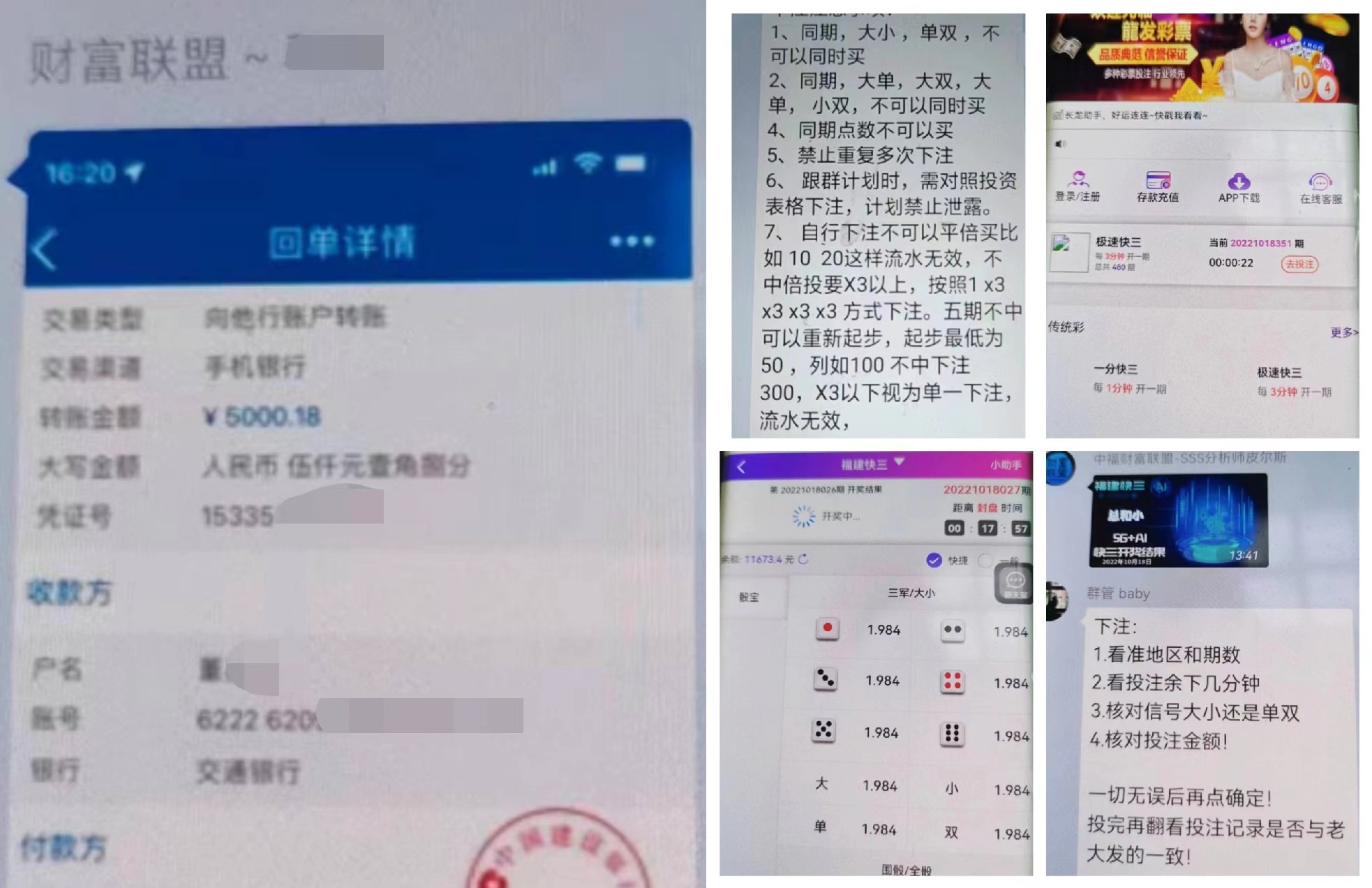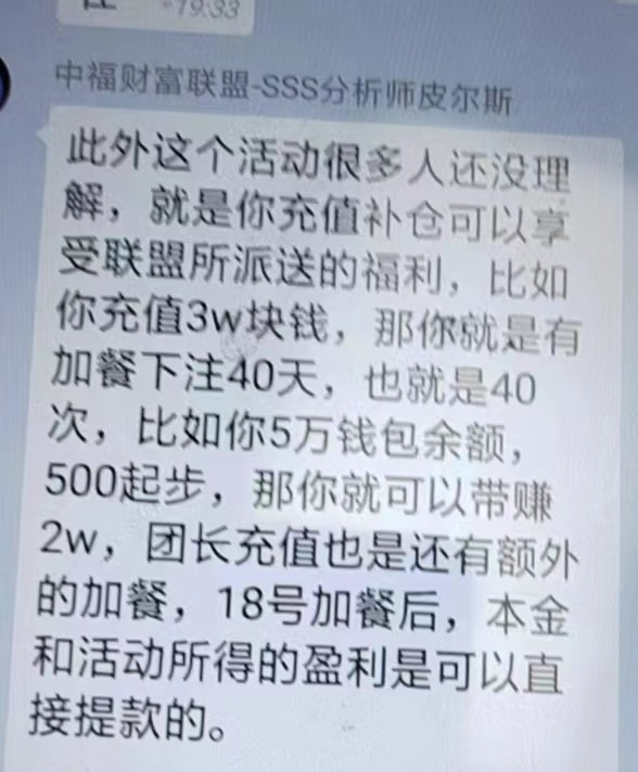 根據(jù)辛某提供的資料來看,“財(cái)富聯(lián)盟”全稱“財(cái)富聯(lián)盟5G+AI計(jì)劃”,是一個基于“龍發(fā)彩票”的組織。組織者組建了一個號稱“三餐”群的群聊,玩家進(jìn)入群聊后,,并充值5000元本金,群里每天會定時有人指導(dǎo)如何在“龍發(fā)彩票”上進(jìn)行投注,一天兩次,一次50元。辛某按照要求投注50天后,流水達(dá)標(biāo)了,也確實(shí)超過本金賺到了錢,但是這是“財(cái)富聯(lián)盟”的提現(xiàn)規(guī)則卻發(fā)生了變化,原本承諾的可全部提現(xiàn)變成了只允許提取本金的一半。