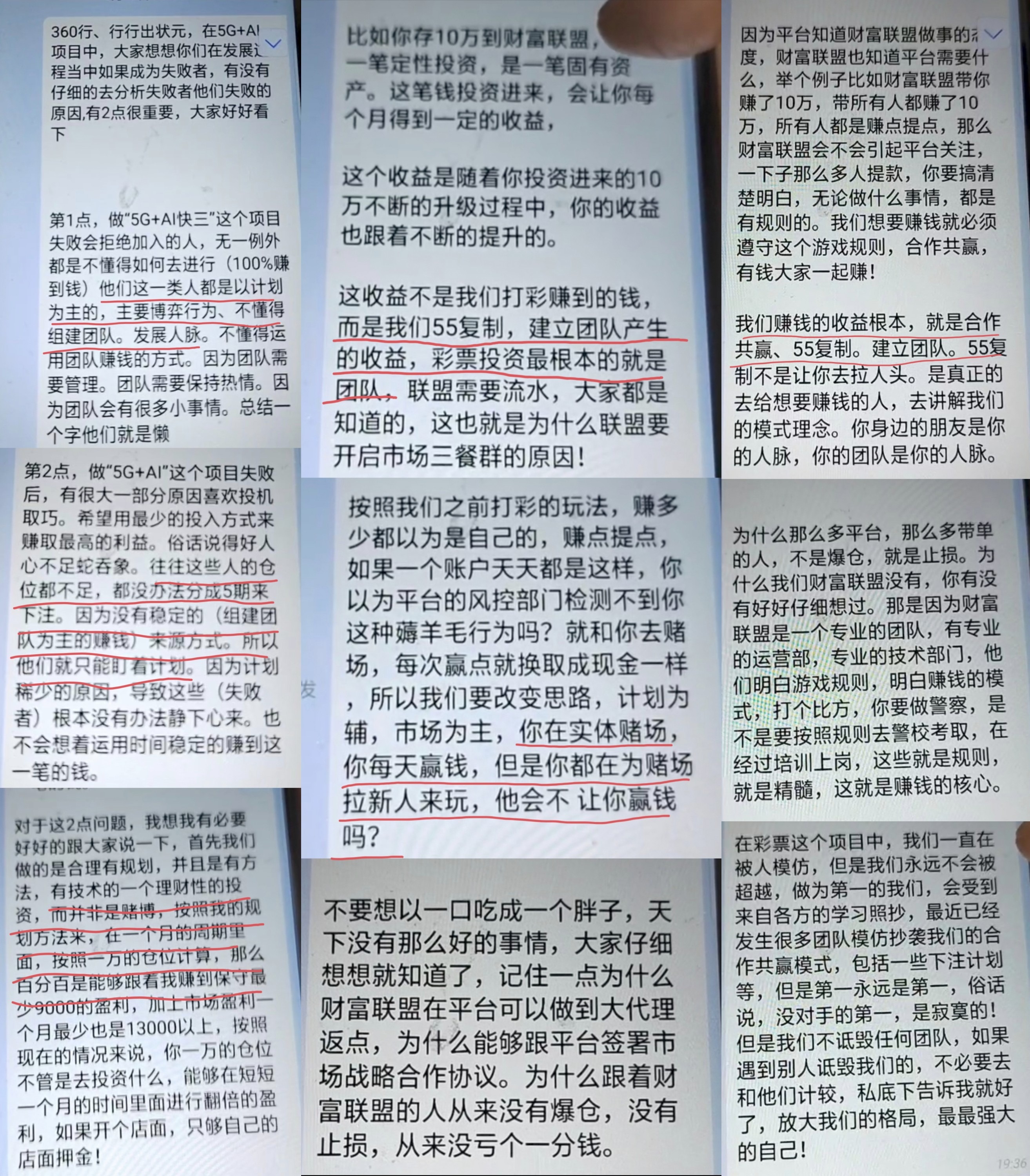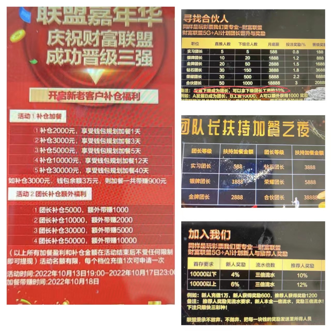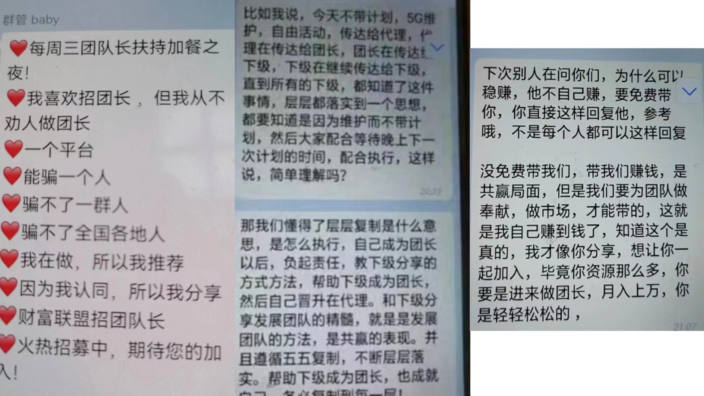 除各種晉級獎勵、投注獎勵、扶持獎勵等等,“財(cái)富聯(lián)盟”還承諾:“發(fā)展下線成為團(tuán)長,可以拿下級團(tuán)長工資的百分之十?!?/strong>并不斷給玩家灌輸各種心靈雞湯,目的只有一個,拉人!