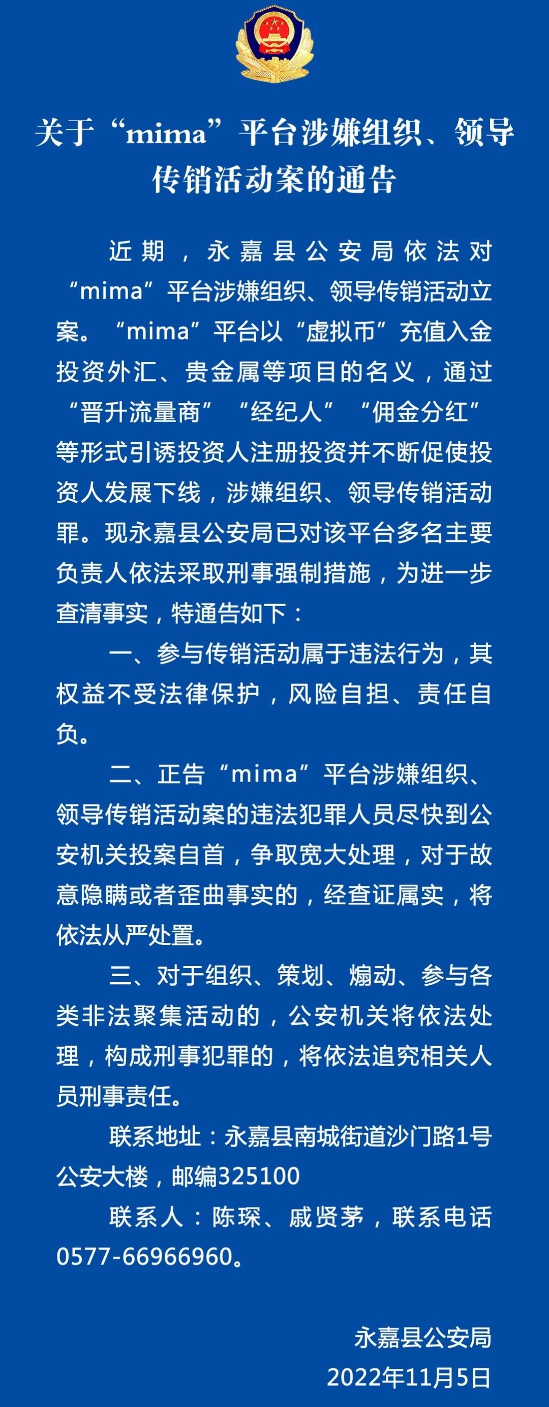 發(fā)表時(shí)間:2022-11-06 18:37作者:永嘉公安微發(fā)布來源:永嘉公安微發(fā)布 關(guān)于“mima”平臺(tái)涉嫌組織、領(lǐng)導(dǎo)傳銷活動(dòng)案的通告 近期,永嘉縣公安局依法對“mima”平臺(tái)涉嫌組織、領(lǐng)導(dǎo)傳銷活動(dòng)立案。“mima”平臺(tái)以“虛擬幣”充值入金投資外匯、貴金屬等項(xiàng)目的名義,通過“晉升流量商”“經(jīng)紀(jì)人”“傭金分紅”等形式引誘投資人注冊投資并不斷促使投資人發(fā)展下線,涉嫌組織、領(lǐng)導(dǎo)傳銷活動(dòng)罪?,F(xiàn)永嘉縣公安局已對該平臺(tái)多名主要負(fù)責(zé)人依法采取刑事強(qiáng)制措施,為進(jìn)一步查清事實(shí),特通告如下: 一、參與傳銷活動(dòng)屬于違法行為,其權(quán)益不受法律保護(hù),風(fēng)險(xiǎn)自擔(dān)、責(zé)任自負(fù)。 二、正告“mima”平臺(tái)涉嫌組織、領(lǐng)導(dǎo)傳銷活動(dòng)案的違法犯罪人員盡快到公安機(jī)關(guān)投案自首,爭取寬大處理,對于故意隱瞞或者歪曲事實(shí)的,經(jīng)查證屬實(shí),將 三、對于組織、策劃、煽動(dòng)、參與各類非法聚集活動(dòng)的,公安機(jī)關(guān)將依法處理,構(gòu)成刑事犯罪的,將依法追究相關(guān)人員刑事責(zé)任。 聯(lián)系地址:永嘉縣南城街道沙門路1號(hào)公安大樓,郵編325100 聯(lián)系人:陳琛、戚賢茅 永嘉縣公安局2022年11月5日 ![]() [此文來源:永嘉公安微發(fā)布,版權(quán)說明:以上文字及圖片來源于網(wǎng)絡(luò),僅供學(xué)習(xí)和交流使用,不具有任何商業(yè)用途,其目的在于傳遞更多的信息,并不代表本平臺(tái)贊同其觀點(diǎn)。版權(quán)歸原作者所有,如涉版權(quán)或來源標(biāo)注有誤,請及時(shí)和我們?nèi)〉寐?lián)系,我們將迅速處理,謝謝!] |