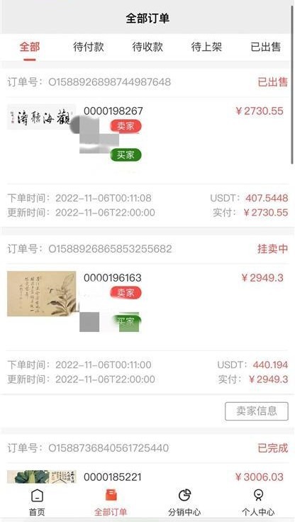 11月8日下午,極目新聞?dòng)浾咄ㄟ^小江提供的鏈接登錄搶購(gòu)字畫的平臺(tái),提示需要輸入賬號(hào)及密碼,“所有的賬戶都是實(shí)名認(rèn)證的,外人是進(jìn)不去的”,在小江提供的截圖中顯示,目前點(diǎn)進(jìn)鏈接后仍可以點(diǎn)擊平臺(tái)首頁的體驗(yàn)區(qū),并能看到字畫和價(jià)格。平臺(tái)分銷中心也可以查到小江的賬號(hào)提現(xiàn)明細(xì)和提現(xiàn)傭金。