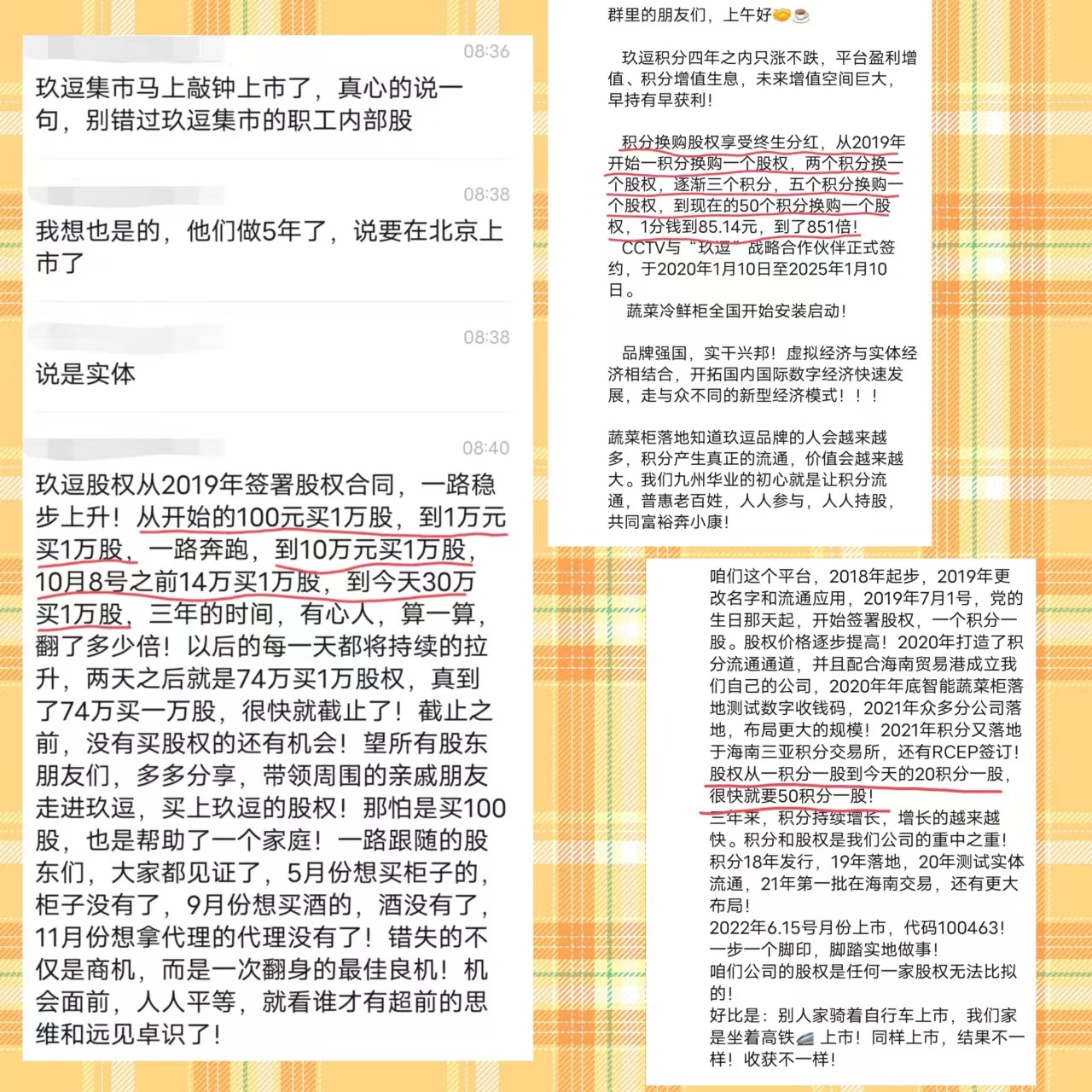 為了吸引更多人購(gòu)買積分或兌換股權(quán),“玖逗”不斷強(qiáng)調(diào)機(jī)會(huì)來(lái)之不易并且即將開始分紅,鼓動(dòng)人們盡快拉人入股。