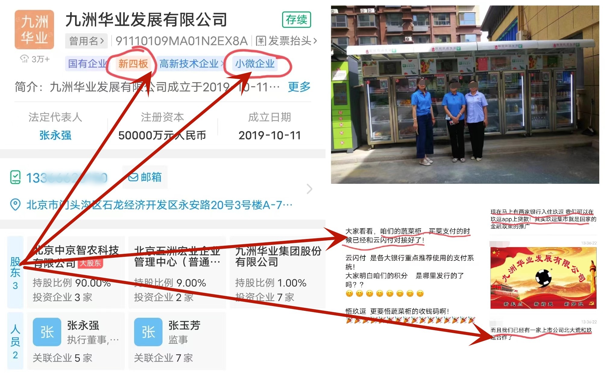 通過(guò)資料顯示,該平臺(tái)隸屬于九州華業(yè)發(fā)展有限公司,法人代表張永強(qiáng)。該公司宣稱自己背靠北京五洲宏業(yè)科技集團(tuán)有限公司,且與多家上市公司達(dá)成合作,旗下智能蔬菜冷鮮柜已在聊城多個(gè)小區(qū)投放,并開通云閃付進(jìn)行支付,是一家實(shí)力強(qiáng)大的國(guó)有實(shí)體企業(yè)。但是我們發(fā)現(xiàn),企查查上,對(duì)該企業(yè)的標(biāo)簽認(rèn)定還僅僅是小微企業(yè)。