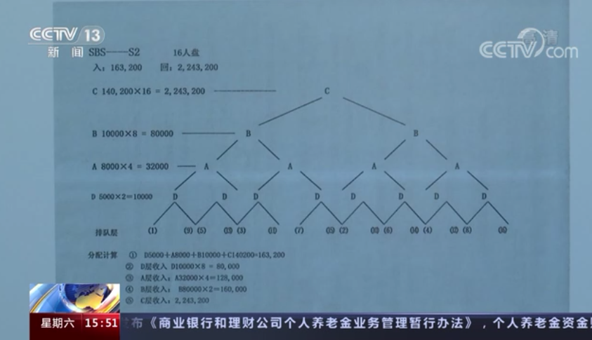 孔涵:這種架構(gòu)是非常明顯的,是常規(guī)的一分二、二分四的發(fā)展形式,每上升一層可以返一部分錢。一開始新成員所交幾萬(wàn)塊錢的所謂“互助金”或者“入會(huì)費(fèi)”,每一層會(huì)拿到一些。比如一個(gè)成員上升兩層之后,可能本金就回來(lái)了,他就會(huì)慢慢排隊(duì),等著再上層分到這些“利潤(rùn)”。