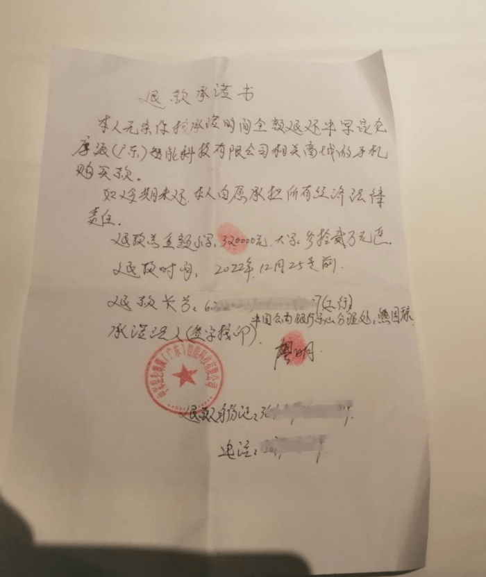 警方介入后,中軍昆侖摩派(廣東)智能科技有限公司法人代表廖明最終答應(yīng)了退還熊國瓊的32萬購機(jī)款。廖明簽字的退款承諾書上顯示:本人無條件退還中軍昆侖摩派(廣東)智能科技有限公司相關(guān)商城的手機(jī)購買款32萬元,退款時(shí)間為2022年12月25日之前,并附有公章和簽名。