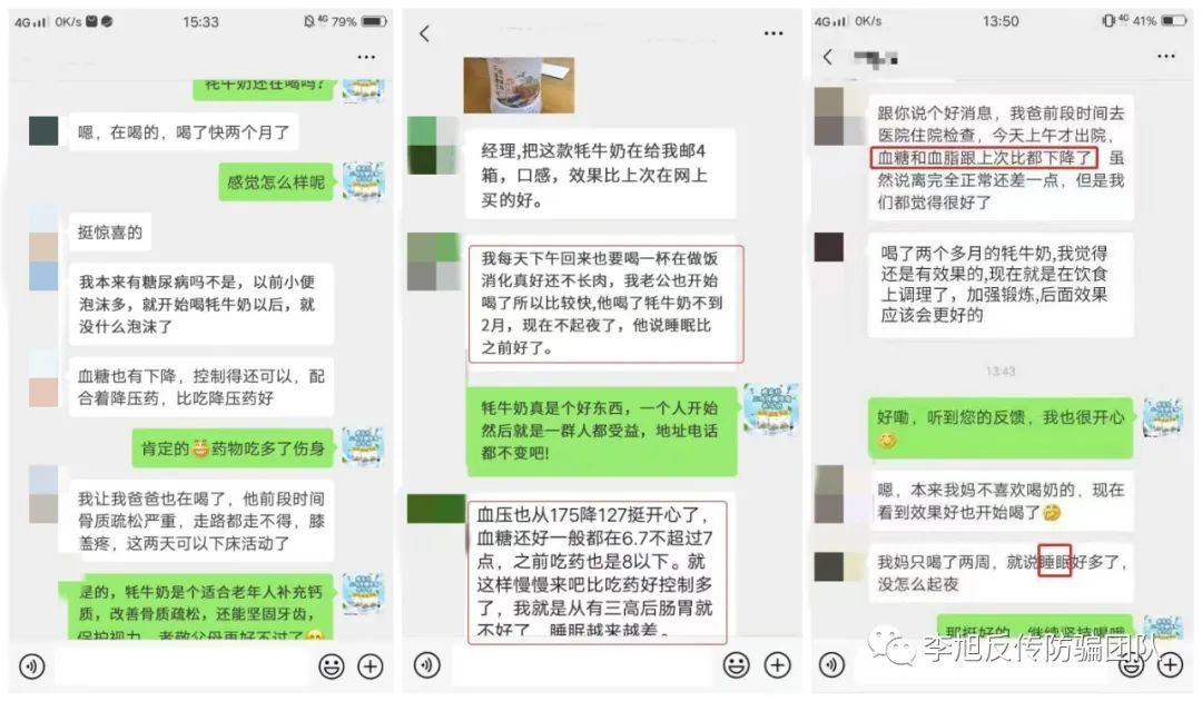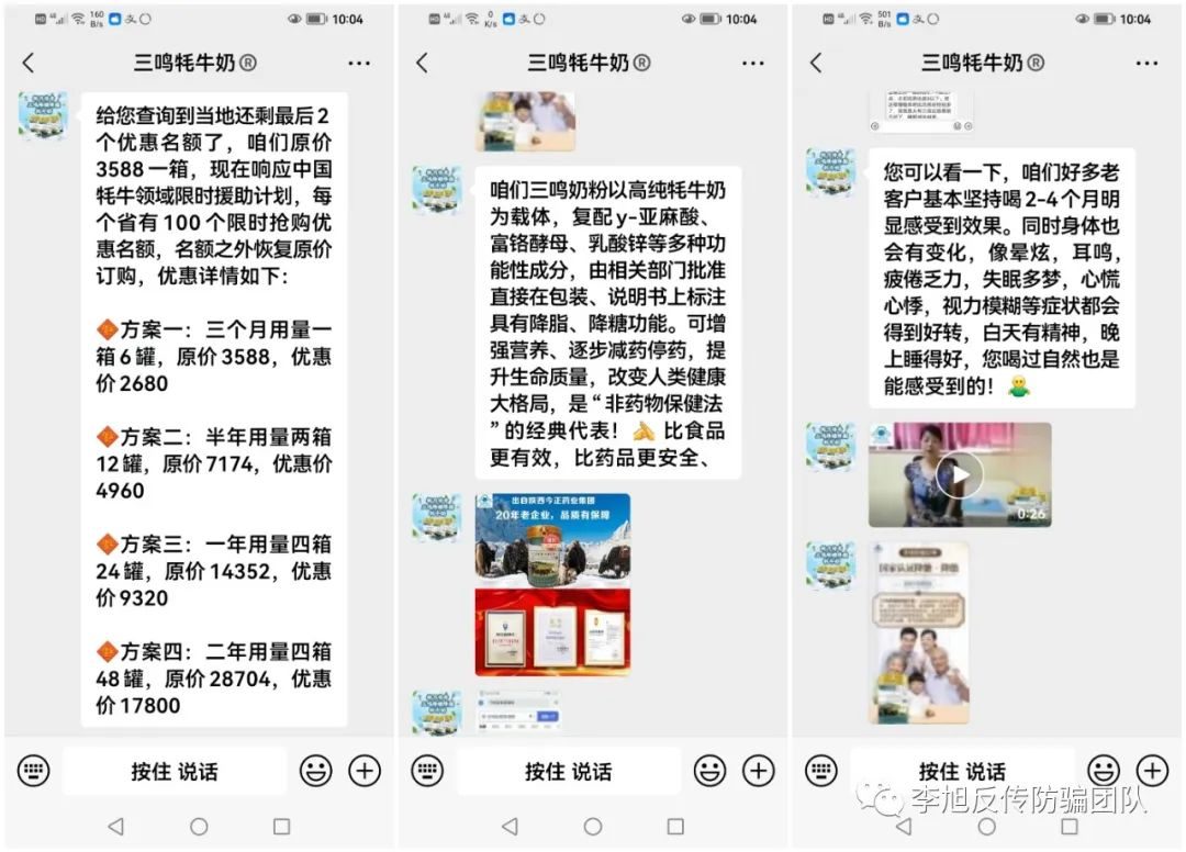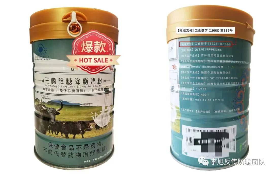 網(wǎng)友小王跟李旭反傳防騙團隊聯(lián)系,她家人經(jīng)朋友介紹,在微信上了解到一款名為“三鳴降糖降脂奶粉”,宣稱這款奶粉可以代替藥物降低血糖和血脂,對視力模糊、耳鳴、心慌心悸等癥狀也有緩解作用,包含小王家人在內(nèi),諸多中老年人相信了這些宣傳,而購買了大量的奶粉。