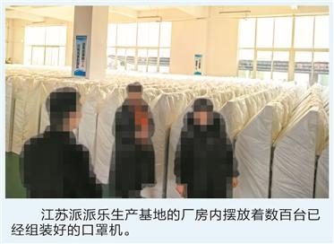 記者春節(jié)前實(shí)地探訪了派派樂最早一家公司的注冊(cè)地——江蘇省宿遷市沭陽縣。自縣城向北約11公里的立派路東側(cè),一棟掛著“派派樂集團(tuán)”標(biāo)識(shí)的醒目藍(lán)色建筑就是它的生產(chǎn)基地,王姓負(fù)責(zé)人稱,“全國所有的機(jī)子都是從我們這里發(fā)出去的”。臨近假期,工人已經(jīng)放假,廠房內(nèi)擺放著數(shù)百臺(tái)已經(jīng)組裝好的口罩機(jī)。