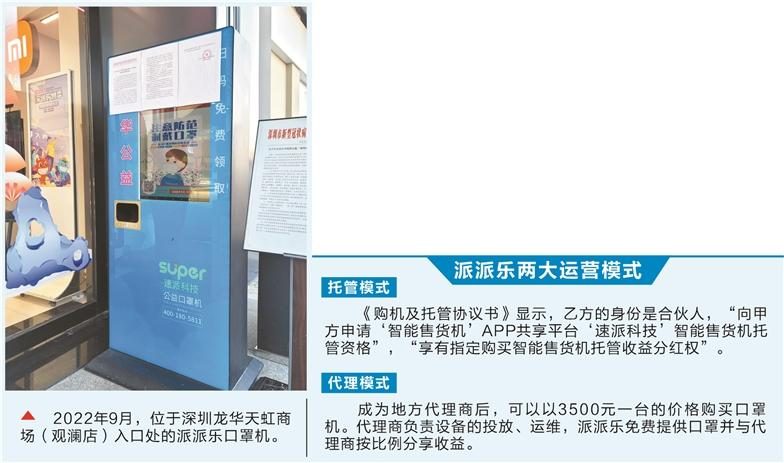 除了托管模式,派派樂還有代理模式。成為地方代理商后,可以以3500元一臺(tái)的價(jià)格購買口罩機(jī)。代理商負(fù)責(zé)設(shè)備的投放、運(yùn)維,派派樂免費(fèi)提供口罩并與代理商按比例分享收益。