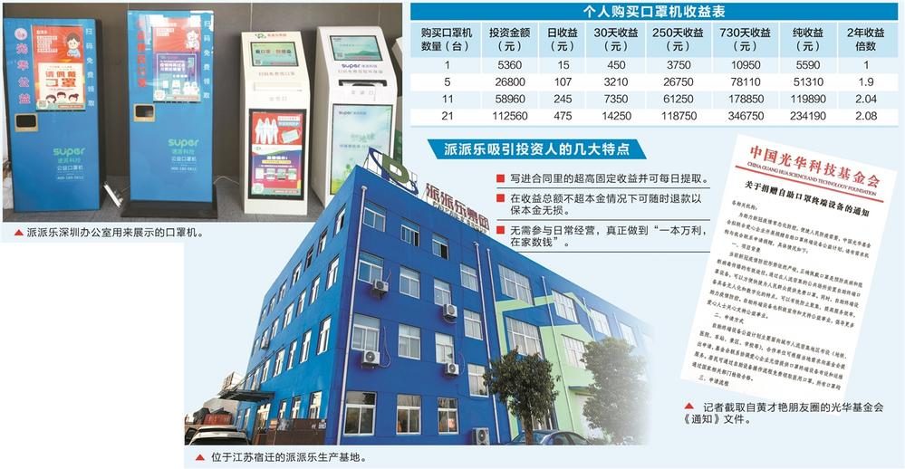 不僅收益奇高,項(xiàng)目還有兩大“亮點(diǎn)”:收益固定并寫進(jìn)合同,按天結(jié)算;購買者無需參與經(jīng)營,設(shè)備交由公司代管。證券時(shí)報(bào)記者了解到,該項(xiàng)目運(yùn)營方是江蘇派派樂科技集團(tuán)有限公司(下稱“派派樂”)。公司在深圳的一位“合伙人”溫茹云(化名)稱,她前后投資了上百臺(tái)口罩機(jī),每天收益近7000元,一年能賺200多萬元。