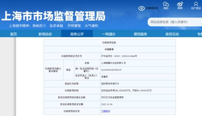 發(fā)表時(shí)間:2023-02-11 17:12作者:中國(guó)經(jīng)濟(jì)網(wǎng)來(lái)源:中國(guó)經(jīng)濟(jì)網(wǎng) 近日,上海市市場(chǎng)監(jiān)督管理局公布的行政處罰決定書(shū)(滬市監(jiān)閔處〔2022〕122021010464號(hào))顯示,上海維娜化妝品有限公司因組織策劃傳銷(xiāo)行為,被閔行區(qū)市場(chǎng)監(jiān)督管理局沒(méi)收違法所得988.283945萬(wàn)元,罰款80萬(wàn)元。處罰決定日期2022年12月26日。 ![]() 經(jīng)中國(guó)經(jīng)濟(jì)網(wǎng)記者計(jì)算,上海維娜化妝品有限公司合計(jì)被罰沒(méi)1068.283945萬(wàn)元。 上海維娜化妝品有限公司成立于2003年4月,注冊(cè)資本360萬(wàn)美元,由維娜香港有限公司全資持股。 官網(wǎng)顯示,韓國(guó)維娜自創(chuàng)立以來(lái)經(jīng)歷了40多年的歷史,維娜在2003年成立了上海維娜化妝品有限公司。在過(guò)去的17年里,維娜以華東和華中地區(qū)為起點(diǎn)在全國(guó)各地共擁有3萬(wàn)多家店鋪以及14家分公司。 據(jù)北青網(wǎng)報(bào)道,在2021年12月28日,上海市藥品監(jiān)督管理局發(fā)布的《關(guān)于化妝品企業(yè)行政檢查情況的通告》,顯示上海市藥品監(jiān)督管理局對(duì)33家化妝品企業(yè)進(jìn)行了飛行檢查,其中有5戶企業(yè)因存在違法違規(guī)行為被立案處罰,包括上海維娜化妝品有限公司。此外,上海維娜化妝品有限公司在2016年12月因在廣告中使用了“國(guó)家級(jí)”、“最高級(jí)”等用語(yǔ),被上海市浦東新區(qū)市場(chǎng)監(jiān)督管理局罰款20萬(wàn)元。在2019年又因進(jìn)口的貨物違反海關(guān)監(jiān)管規(guī)定被上海浦江海關(guān)罰款6300元。 [此文來(lái)源:中國(guó)經(jīng)濟(jì)網(wǎng),版權(quán)說(shuō)明:以上文字及圖片來(lái)源于網(wǎng)絡(luò),僅供學(xué)習(xí)和交流使用,不具有任何商業(yè)用途,其目的在于傳遞更多的信息,并不代表本平臺(tái)贊同其觀點(diǎn)。版權(quán)歸原作者所有,如涉版權(quán)或來(lái)源標(biāo)注有誤,請(qǐng)及時(shí)和我們?nèi)〉寐?lián)系,我們將迅速處理,謝謝!]