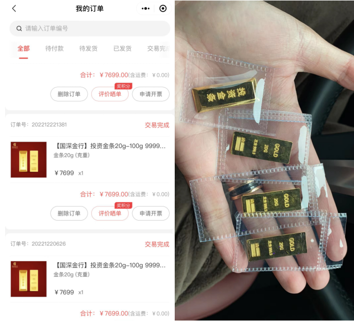 侯小姐說,去年11月,她通過微信群里得知,有群友在網(wǎng)上買到了比市價(jià)更低的實(shí)體黃金,于是她通過一個(gè)名為“國深金行”的微信小程序開始買黃金。
