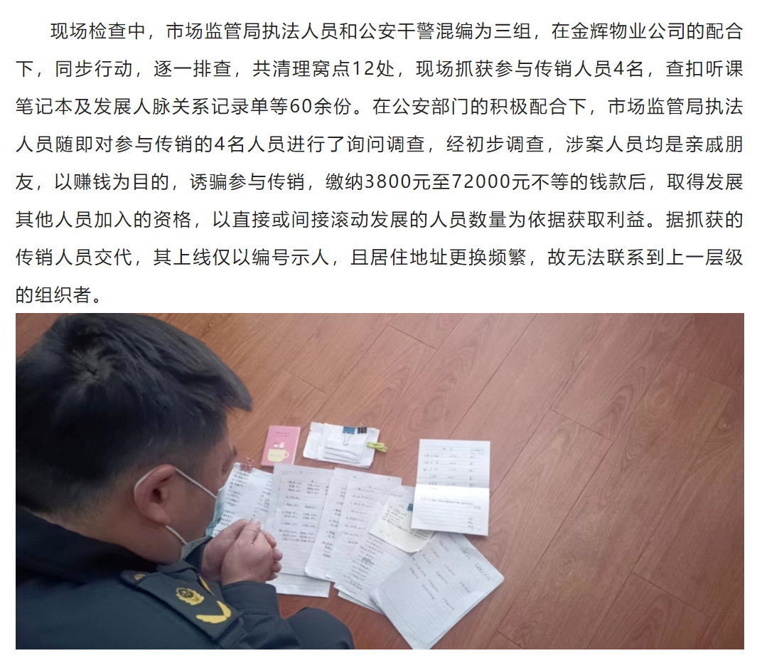 ▲圖片來源:句容市市場監(jiān)督管理局《句容市市場監(jiān)管局聯(lián)合公安部門開展打擊傳銷集中行動》
