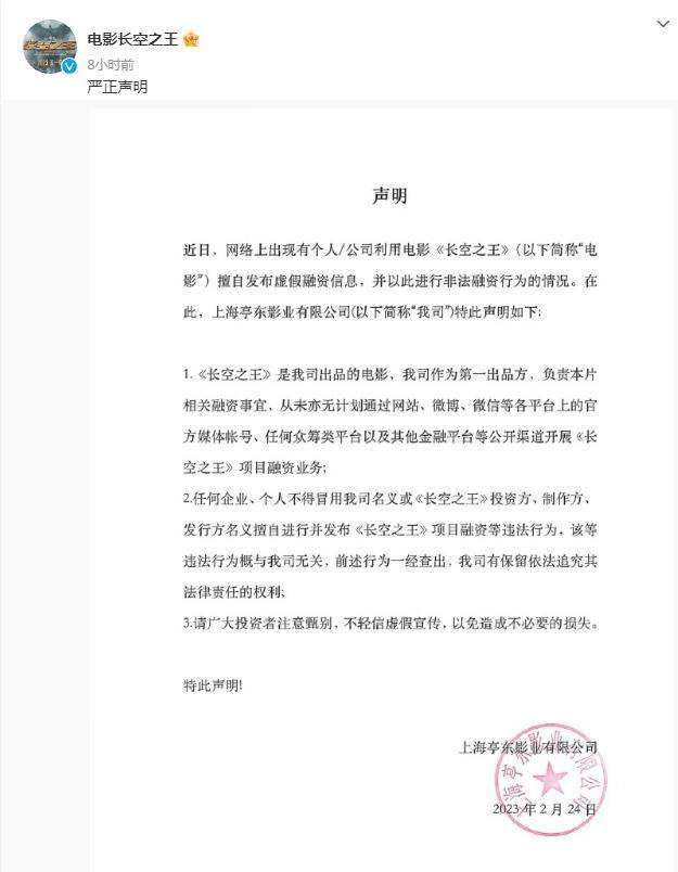 上周五,電影《長空之王》發(fā)布聲明表示,沒有計(jì)劃通過公開渠道開展項(xiàng)目融資業(yè)務(wù),提醒投資者注意甄別。