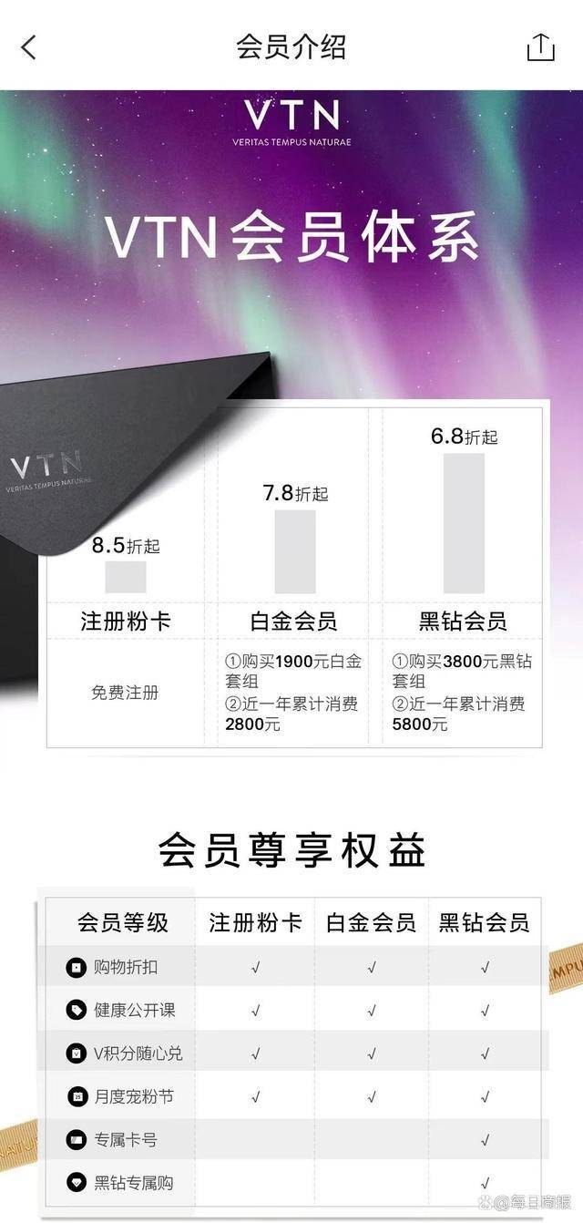 據(jù)了解,當(dāng)前VTN的會(huì)員體系分別為粉卡、白金、黑鉆、黑鉆plus四個(gè)級(jí)別。VTN發(fā)布的“VTN會(huì)員制度升級(jí)通知”顯示,新人注冊(cè)即可直接成為粉卡,又名“注冊(cè)粉卡”,可享受會(huì)員權(quán)益——購(gòu)物享8.5折起;如購(gòu)買價(jià)值1900元白金套組,或近一年消費(fèi)累計(jì)滿2800元即可升級(jí)白金會(huì)員;購(gòu)買價(jià)值3800元的黑鉆套組,或近一年消費(fèi)累計(jì)滿5800元升級(jí)成黑鉆會(huì)員。其中,白金會(huì)員和黑鉆會(huì)員購(gòu)物分別享7.8折起和6.8折起的優(yōu)惠,會(huì)員級(jí)別越高優(yōu)惠力度越大,同時(shí)享受的權(quán)益更多。