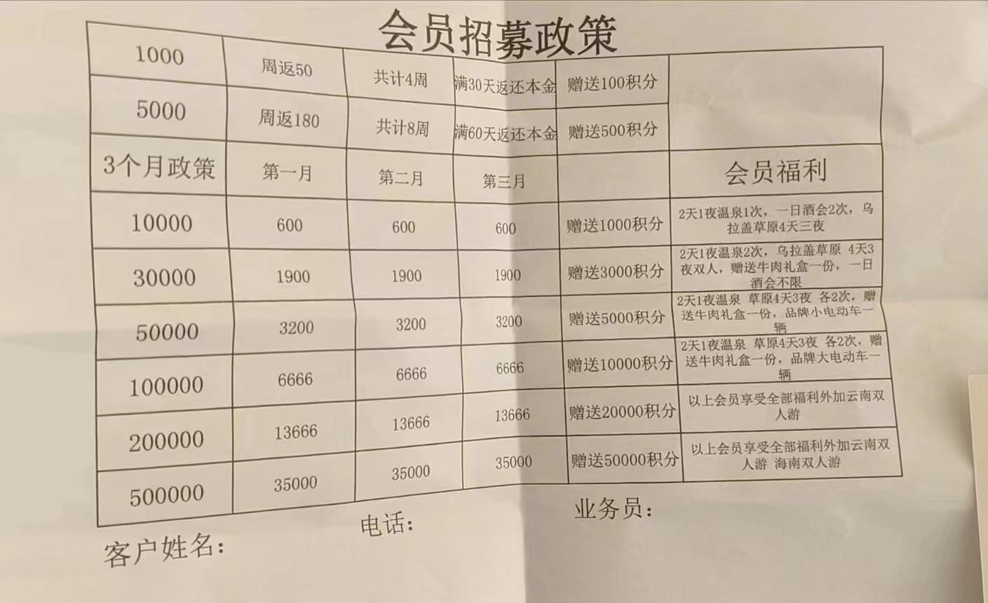 通過現(xiàn)場封鎖以及相關(guān)工作人員詢問,民警了解到該門市僅試營業(yè)2日,試營業(yè)期間通過業(yè)務(wù)員到老年人聚集的場所以“到店了解情況就贈送掛面或者水果”為吸引,對進(jìn)店老年人推銷其會員機(jī)制,即交會費(fèi)可享按月高額返息,且會費(fèi)越高返息越多,還可以享受旅游、購買牛肉、兌換積分等權(quán)利。熟不知你圖人家高息,人家圖你本金。