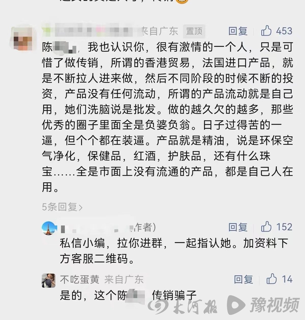 熱度在不斷發(fā)酵。大河報(bào)·豫視頻《看見》記者聯(lián)系到多名指認(rèn)者,他們稱自己是傳銷受騙者,曾受騙于某跨境傳銷組織廣州團(tuán)隊(duì),通過這個(gè)帖子認(rèn)出這名相親的女子是該傳銷團(tuán)伙成員,“傳銷最擅長的套路之一就是在各種交友相親社交平臺(tái)騙人入甕,再一步步養(yǎng)熟‘宰豬’,希望大家警惕”。