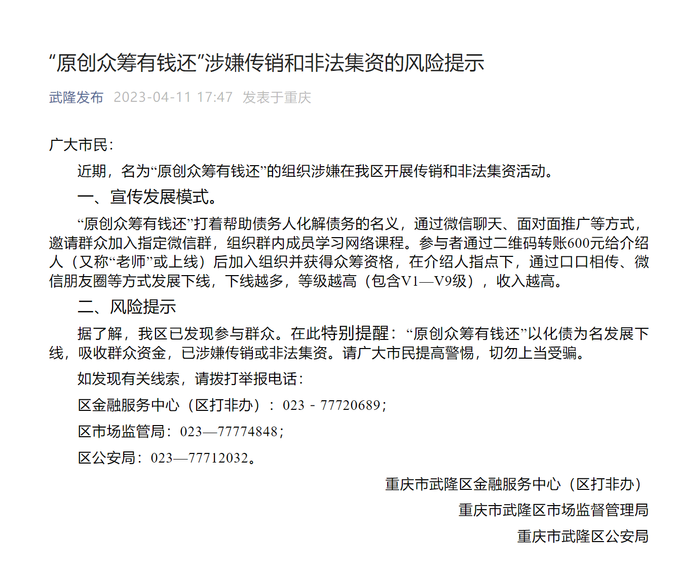 發(fā)表時間:2023-04-12 19:45作者:武隆發(fā)布來源:武隆發(fā)布 廣大市民: 近期,名為“原創(chuàng)眾籌有錢還”的組織涉嫌在我區(qū)開展傳銷和非法集資活動。 一、宣傳發(fā)展模式 “原創(chuàng)眾籌有錢還”打著幫助債務(wù)人化解債務(wù)的名義,通過微信聊天、面對面推廣等方式,邀請群眾加入指定微信群,組織群內(nèi)成員學(xué)習(xí)網(wǎng)絡(luò)課程。參與者通過二維碼轉(zhuǎn)賬600元給介紹人(又稱“老師”或上線)后加入組織并獲得眾籌資格,在介紹人指點(diǎn)下,通過口口相傳、微信朋友圈等方式發(fā)展下線,下線越多,等級越高(包含V1—V9級),收入越高。 二、風(fēng)險提示 據(jù)了解,我區(qū)已發(fā)現(xiàn)參與群眾。在此特別提醒:“原創(chuàng)眾籌有錢還”以化債為名發(fā)展下線,吸收群眾資金,已涉嫌傳銷或非法集資。請廣大市民提高警惕,切勿上當(dāng)受騙。 如發(fā)現(xiàn)有關(guān)線索,請撥打舉報電話。 重慶市武隆區(qū)金融服務(wù)中心(區(qū)打非辦) 重慶市武隆區(qū)市場監(jiān)督管理局 重慶市武隆區(qū)公安局