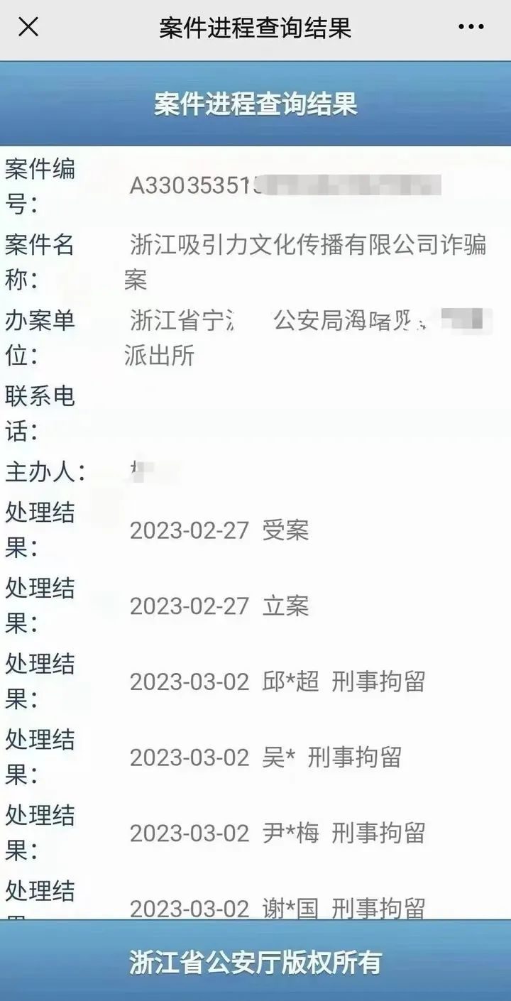 臥底的工作人員配合警方,2023年3月2日凌晨,警察前往吸引力公司總部,“成功學(xué)大師”楊濤鳴及其團(tuán)隊被浙江省寧波市公安局海曙分局以詐騙罪立案調(diào)查,30多人被警方刑拘。