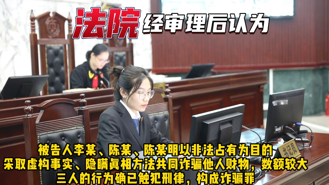 綜合三被告人犯罪的事實(shí)、性質(zhì)、情節(jié)及對社會的危害性,依法作出判決:被告人李某、陳某犯詐騙罪,判處有期徒刑一年,并處罰金5000元;被告人陳某明犯詐騙罪,判處有期徒刑九個月,并處罰金4000元。