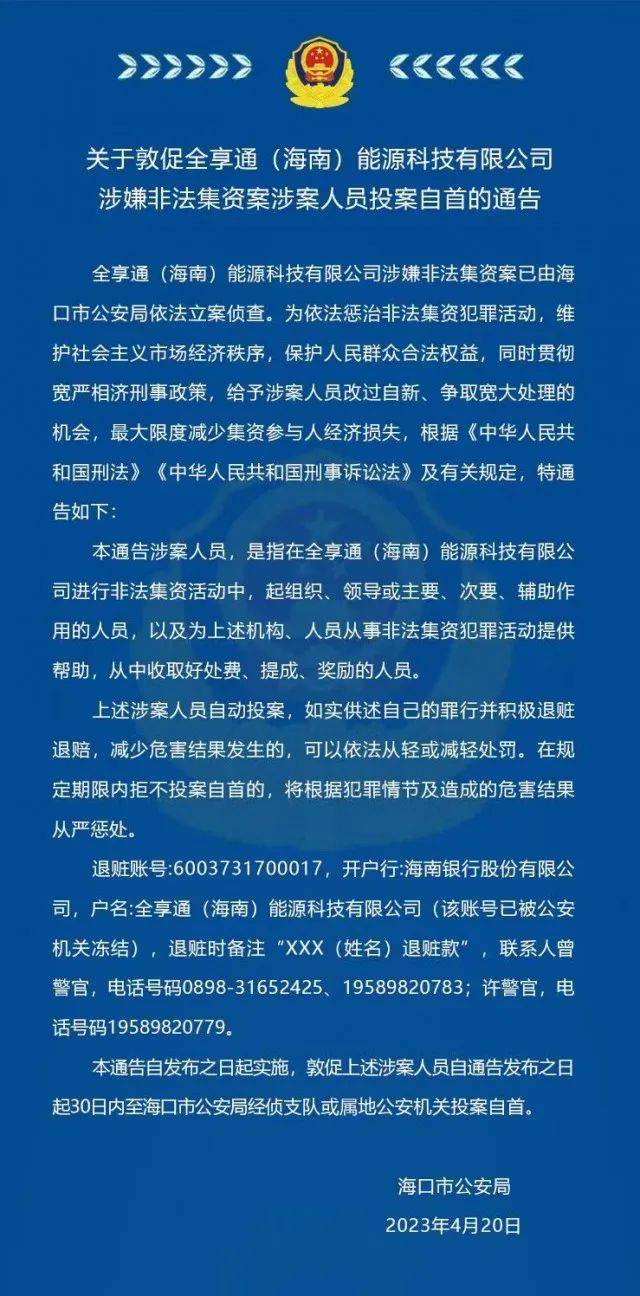 4月20日,??谑泄簿职l(fā)布關(guān)于敦促全享通(海南)能源科技有限公司涉嫌非法集資案涉案人員投案自首的通告,全文如下: