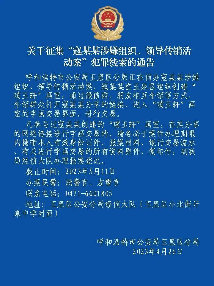 發(fā)表時(shí)間:2023-04-29 19:11作者:劉惠來源:正北方網(wǎng)、平安玉泉 4月28日,呼和浩特市玉泉區(qū)公安分局公開征集“寇某某涉嫌組織、領(lǐng)導(dǎo)傳銷活動(dòng)案”犯罪線索。 據(jù)介紹,玉泉區(qū)公安分局正在偵辦寇某某涉嫌組織、領(lǐng)導(dǎo)傳銷活動(dòng)案??苣衬?span style="font-weight:700;border:0px;margin:0px;padding:0px;">在玉泉區(qū)組織創(chuàng)建“璞玉軒”畫室,通過微信群、朋友相互介紹等方式,介紹群眾打開寇某某分享的鏈接,進(jìn)入“璞玉軒”畫室的字畫交易界面進(jìn)行交易。 警方呼吁,凡參與過寇某某創(chuàng)建的“璞玉軒”畫室、在其分享的網(wǎng)絡(luò)鏈接進(jìn)行字畫交易的,請(qǐng)務(wù)必于案件辦理期限內(nèi)(截止5月11日)攜帶本人有效身份證件、報(bào)案材料、銀行交易流水、有關(guān)進(jìn)行字畫交易的所有資料原件、復(fù)印件,到玉泉區(qū)公安分局經(jīng)偵大隊(duì)辦理報(bào)案登記。