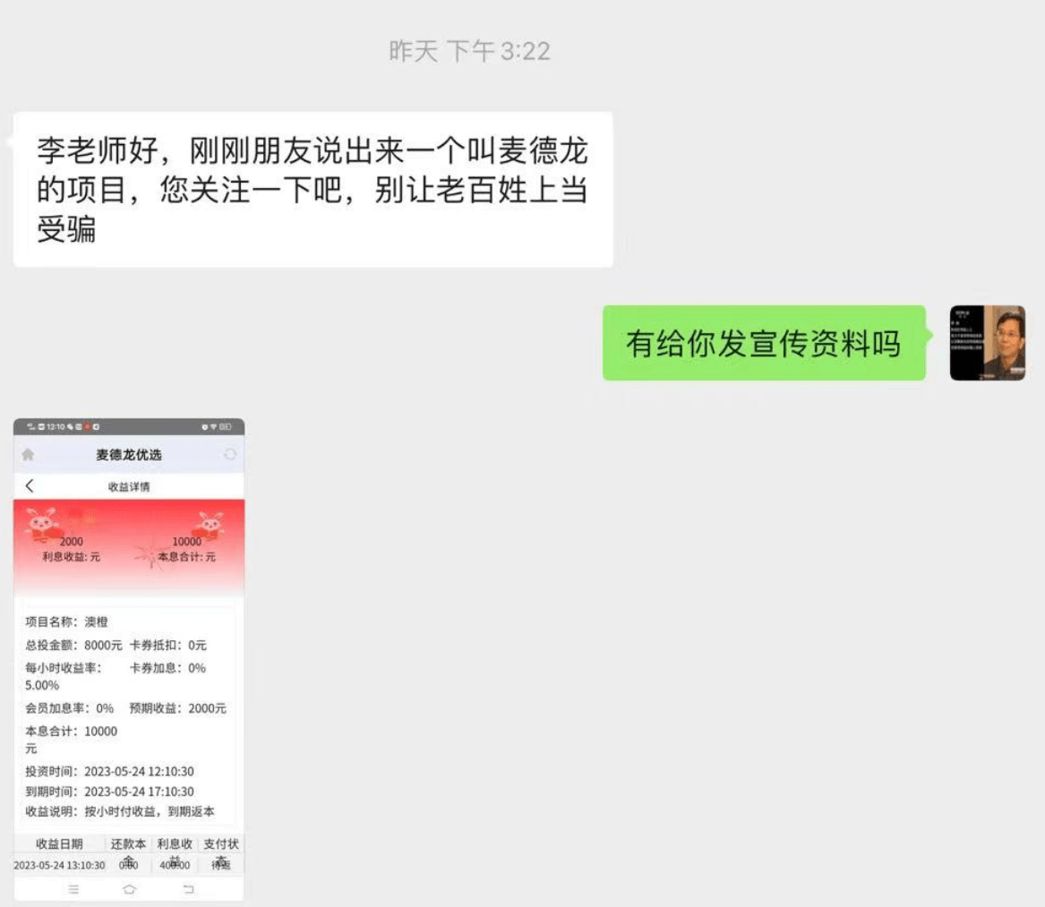 昨天,網(wǎng)友張先生(化名)向李旭反傳防騙團(tuán)隊(duì)反饋一個(gè)名為“麥德龍優(yōu)選”的項(xiàng)目,希望我們曝光,防止更多人上當(dāng)受騙。