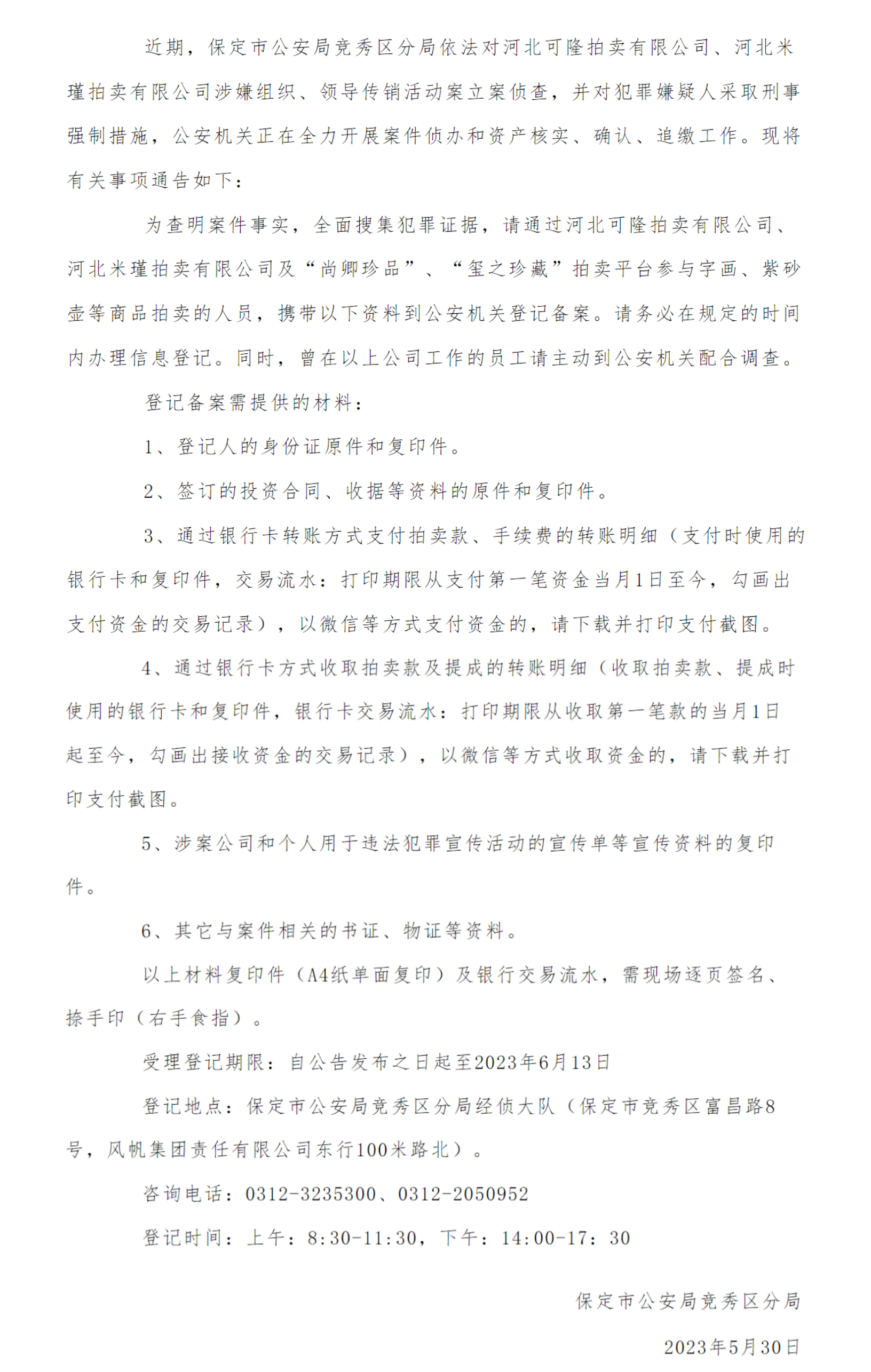 為查明案件事實(shí),全面搜集犯罪證據(jù),請通過河北可隆拍賣有限公司、河北米瑾拍賣有限公司及“尚卿珍品”、“璽之珍藏”拍賣平臺(tái)參與字畫、紫砂壺等商品拍賣的人員,攜帶以下資料到公安機(jī)關(guān)登記備案。請務(wù)必在規(guī)定的時(shí)間內(nèi)辦理信息登記。同時(shí),曾在以上公司工作的員工請主動(dòng)到公安機(jī)關(guān)配合調(diào)查。